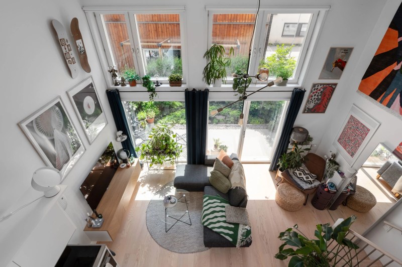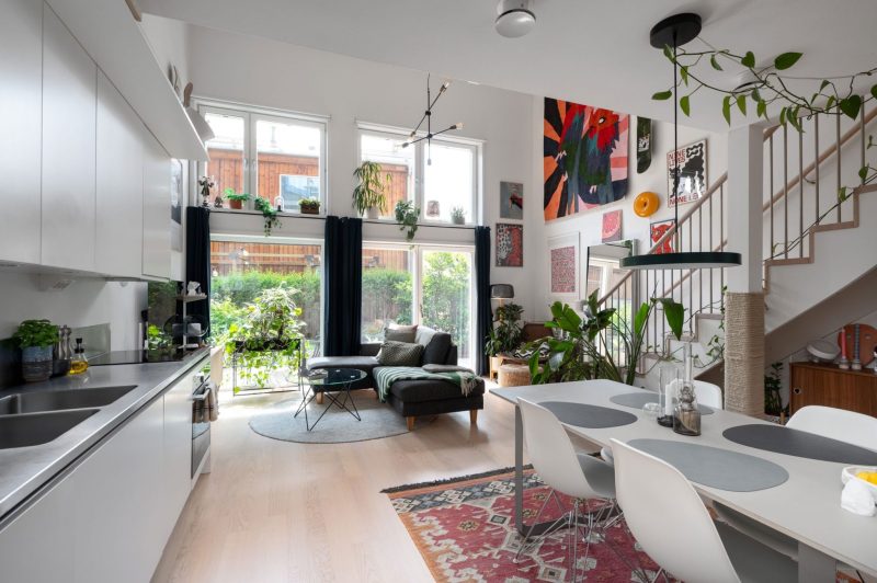 Intérieur élégant d’un loft en Suède, avec de grandes fenêtres, un coin salon confortable, et un accès direct à un jardin intimiste.