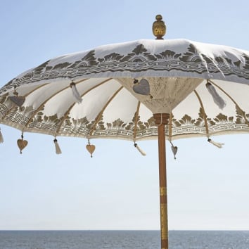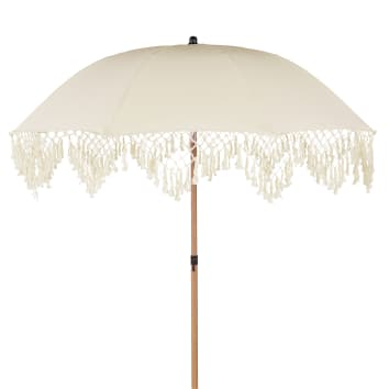 Optez pour une terrasse à l’allure romantique avec l’ombrelle en polycoton écru avec franges MANILA.