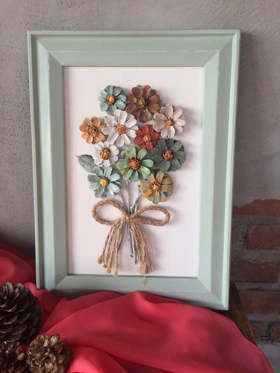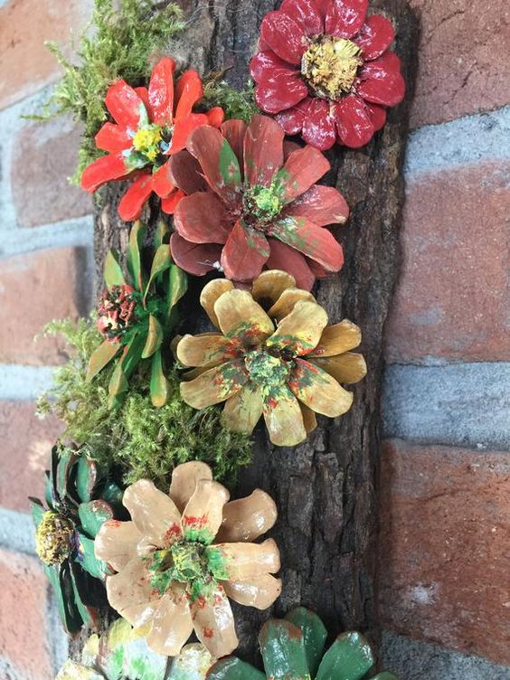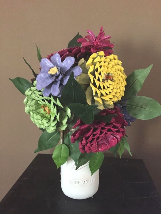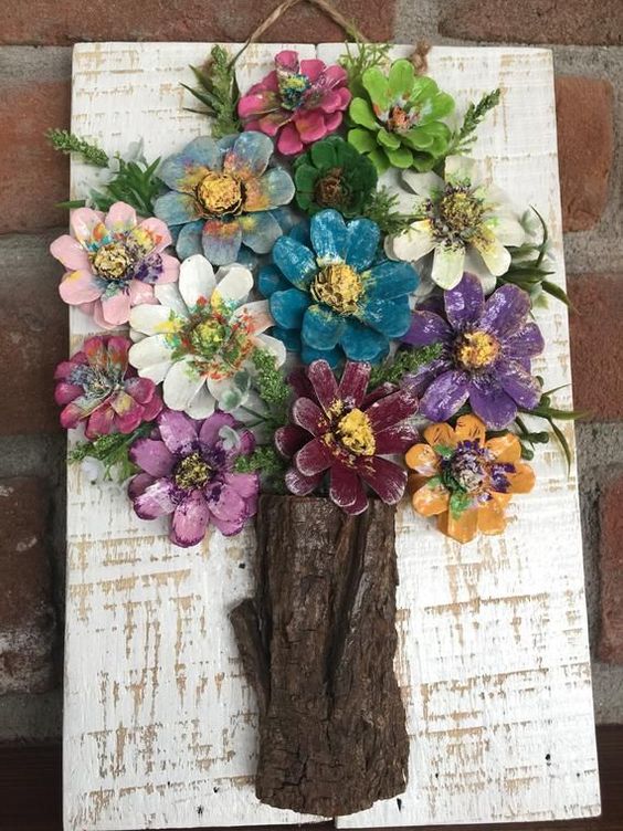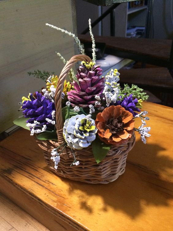 Avec des pommes de pin, vous pouvez créer des compositions florales colorées qui déchirent et impressionnent à coup sûr ! Un tableau à accrocher dans le salon ou dans la chambre des enfants.Prenez beaucoup de pommes de pin et colorez-les avec les couleurs les plus vives, puis remplissez un vase en verre.Un panier de fleurs qui ne sont rien d’autre que des pommes de pin colorées: le printemps entre dans votre intérieur.