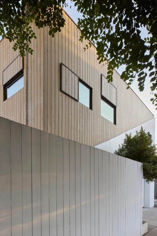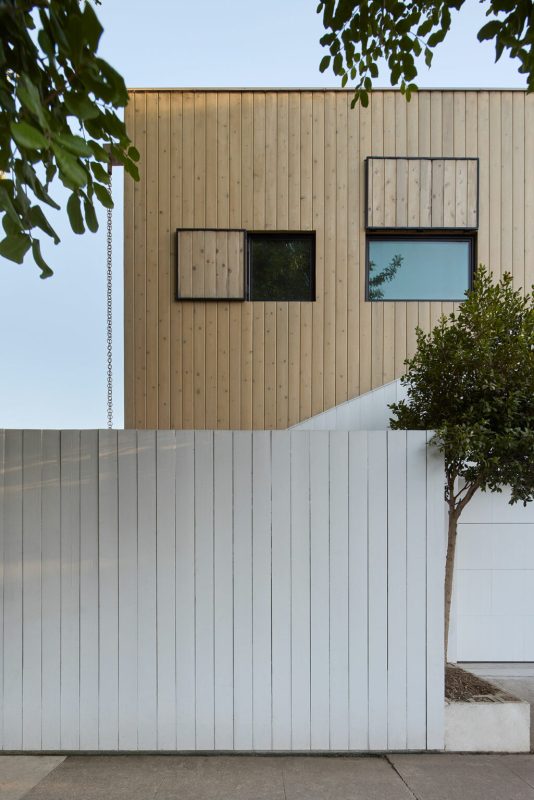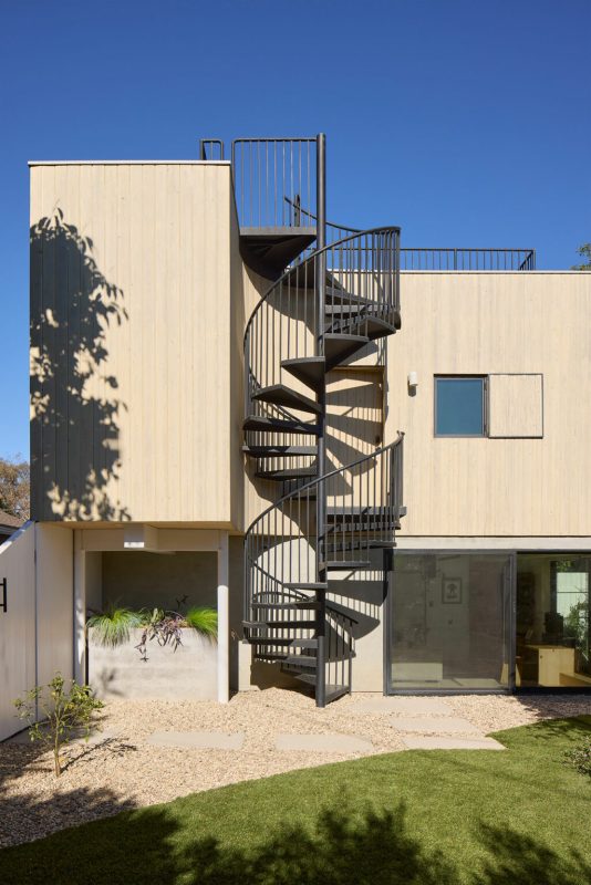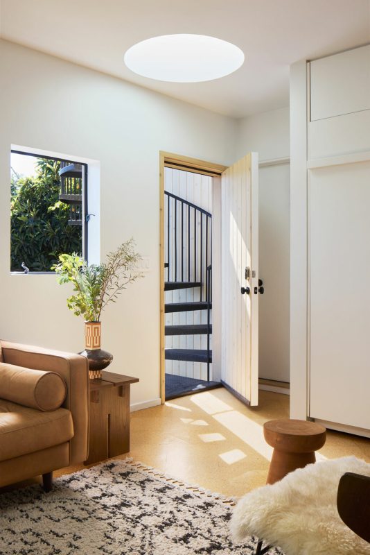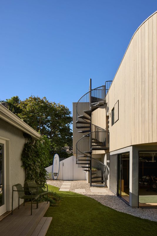Depuis la rue, l’ADU présente une silhouette épurée et géométrique, adoucie par un revêtement blanc à rayures diagonales qui prolonge la ligne de la clôture avant existante. En contournant l’arrière, la forme carrée se fond dans des courbes fluides, adoucies par des puits de lumière arrondis et des détails arqués.