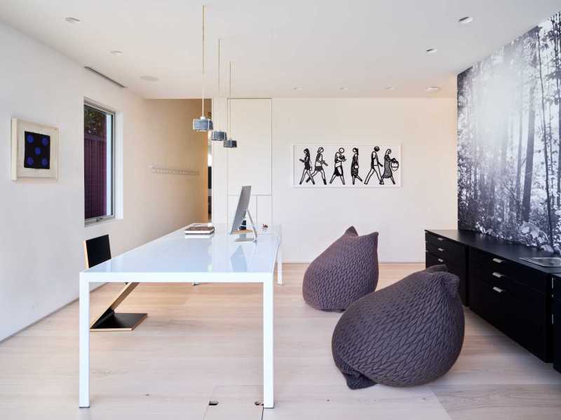 La maison dispose de deux bureaux, chacun avec son propre style. L’un est équipé d’étagères murales en bois et d’un bureau, tandis que l’autre est doté d’un bureau blanc et d’une grande fresque murale en noir et blanc. Les deux bureaux donnent sur le jardin.
