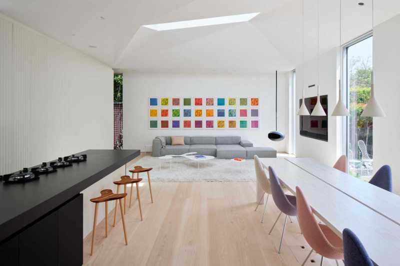 En entrant, vous découvrirez un salon spacieux et lumineux avec des œuvres d’art colorées de Sol LeWitt et une cheminée noire suspendue Cocoon Aeris.