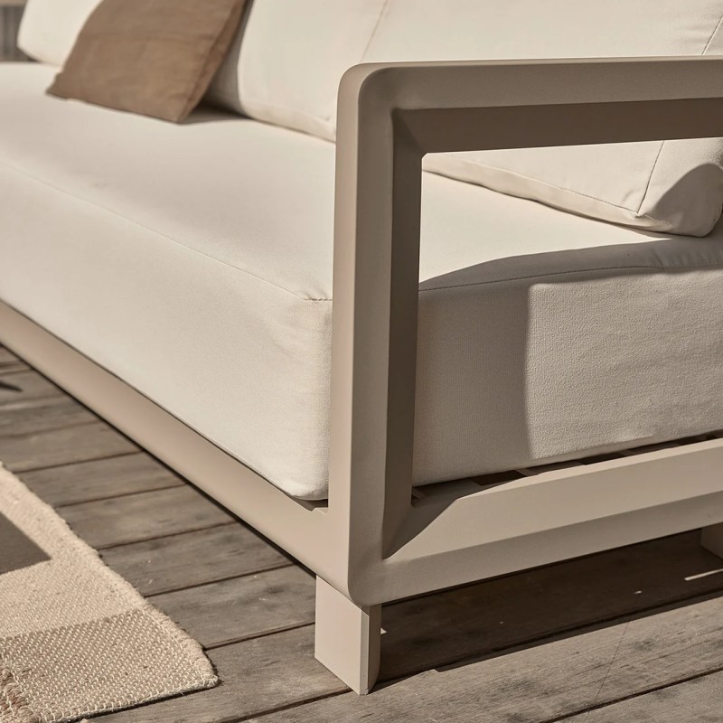 Le salon de jardin CALIZA vous invite à redessiner votre extérieur comme un véritable lieu de vie. Avec son allure architecturale douce, sa structure enveloppante en aluminium beige sable, ses coussins généreux et sa table basse effet travertin, il incarne l’art de recevoir en plein air avec style et simplicité.