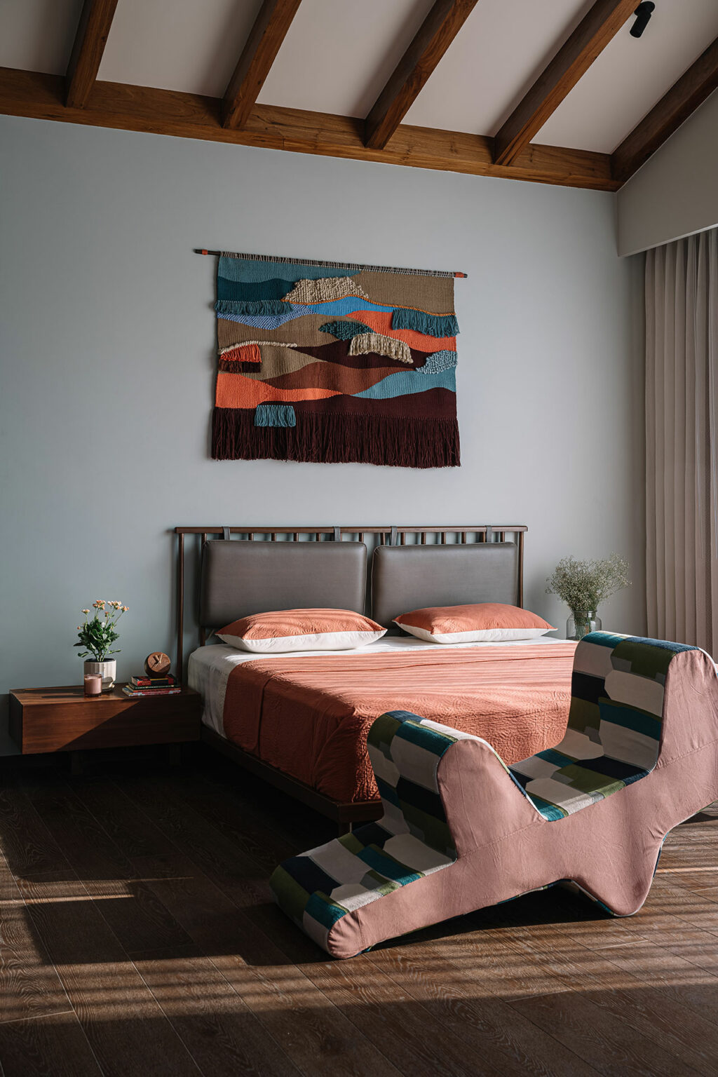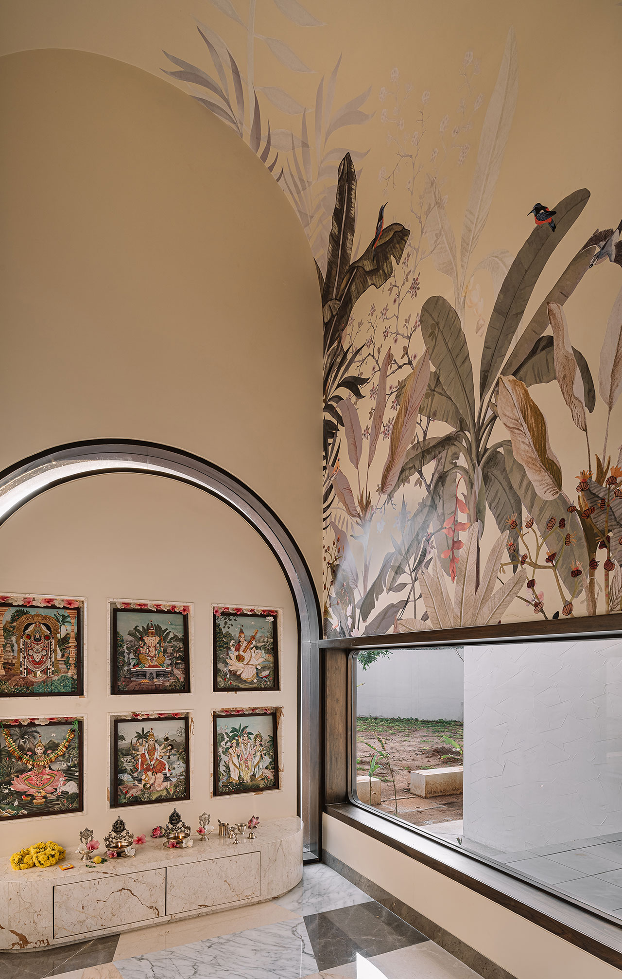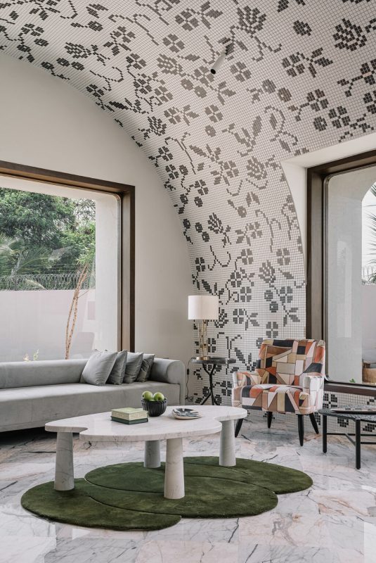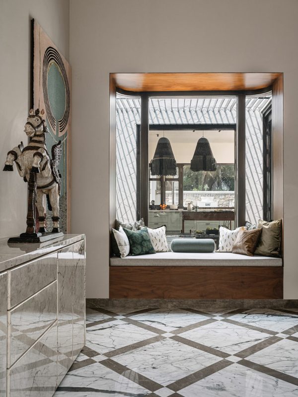 À la fois demeure principale et domicile permanent, les propriétaires actuels ont défié l’équipe de conception de créer une résidence audacieuse : saisir l’essence de la typologie de l’hacienda tout en se jouant du vernaculaire du Chettinad, manipuler le Manaiyadi Shastram selon les dogmes du Vastu Shastra et façonner une oasis en plein centre-ville. Tout comme une baie vitrée bien pensée défie la perspective, la géométrie de chaque pièce et l’agencement du mobilier éveillent des émotions brutes, qu’on le veuille ou non.