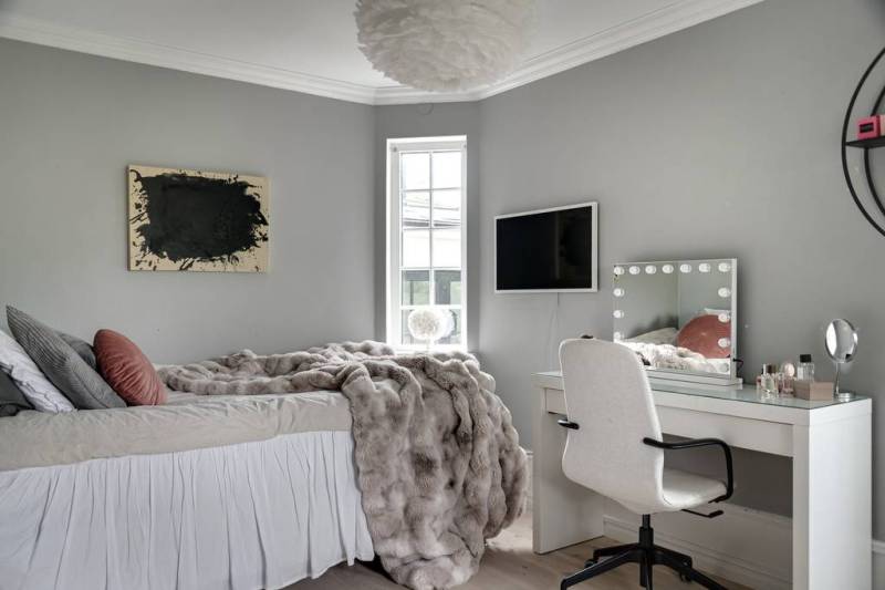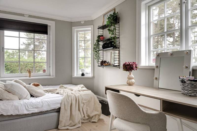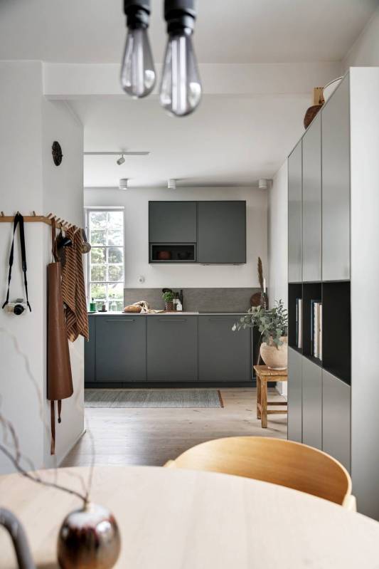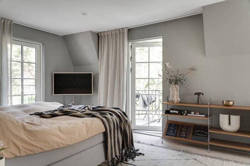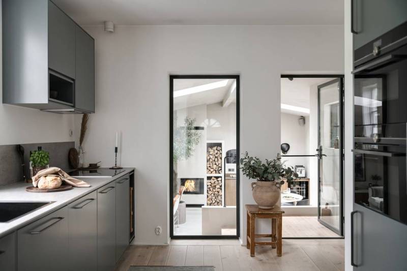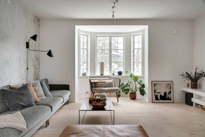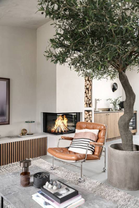 Derrière son extérieur ancien, cette maison de style classique suédois dévoile des volumes impressionnants et une décoration contemporaine en tons neutres qui ne manquent pas de séduire. Loin d’être ordinaire, l’espace de vie flamboyant est dominé par un salon, véritable bijou de la maison, qui mélange habilement le vintage au design audacieux, orné d’une cheminée à couper le souffle. On aime ce grand olivier en pot qui trône fièrement là pour l’hiver, attendant avec impatience de reprendre sa place dans le jardin dès que les températures s’adoucissent.