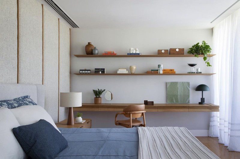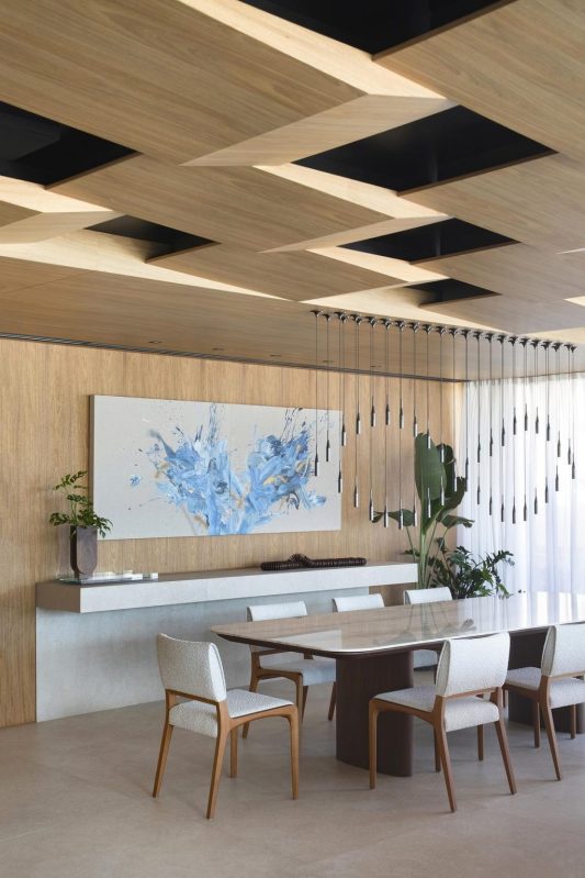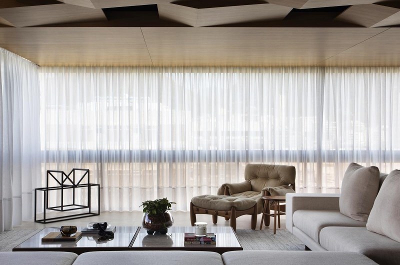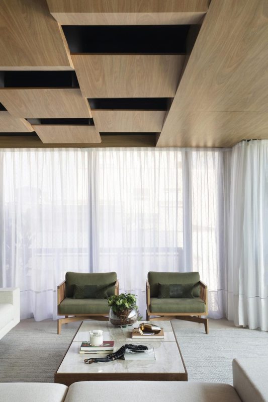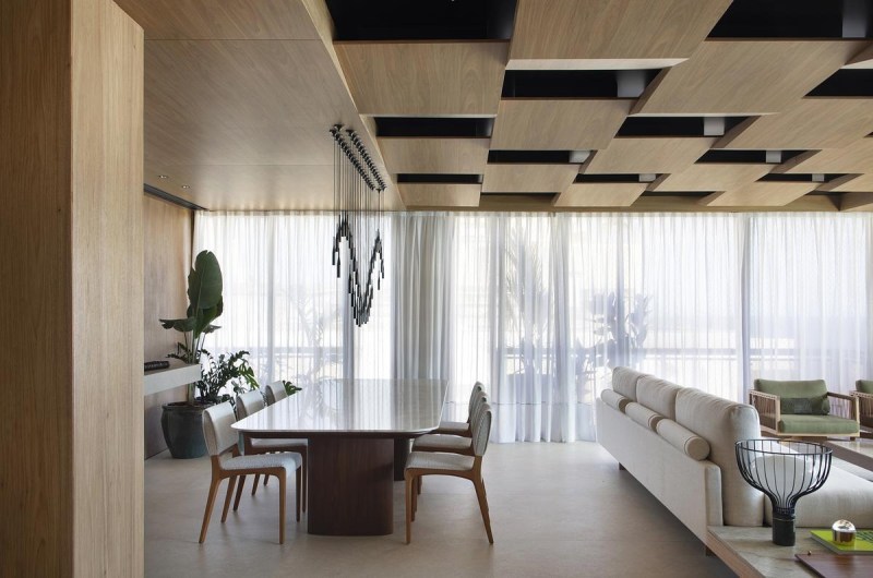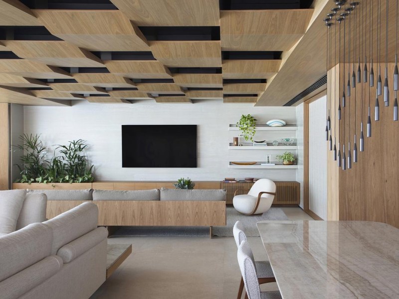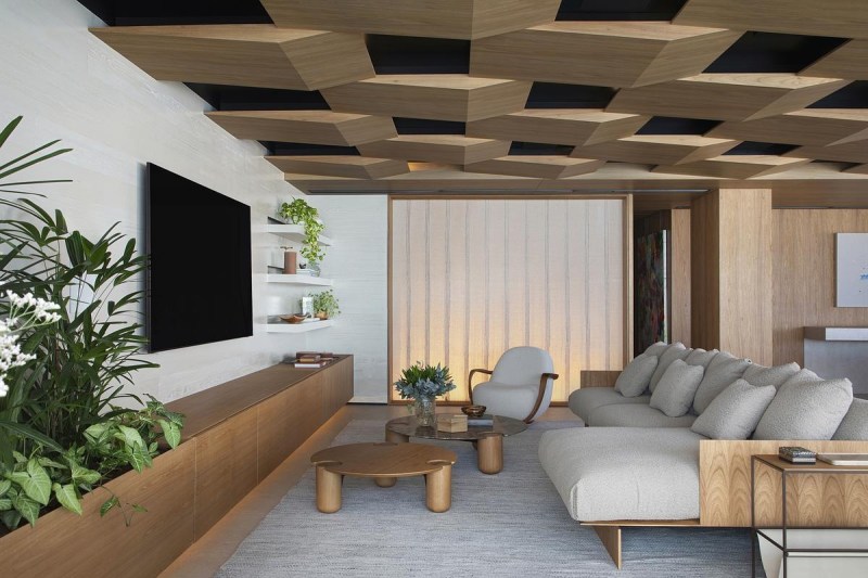 Magarão + Lindenberg Arquitectura transforme un banal appartement en un havre de paix lumineux où confort, intégration et design brésilien contemporain ne sont pas seulement présents, mais envoûtants. L’un des éléments les plus marquants de la maison est son plafond en bois, né de la nécessité et élevé au rang d’œuvre d’art. Les poutres structurelles et les conduits de climatisation empêchaient un plafond classique. Les architectes ont donc opté pour une menuiserie à motifs qui rythme visuellement les pièces centrales.