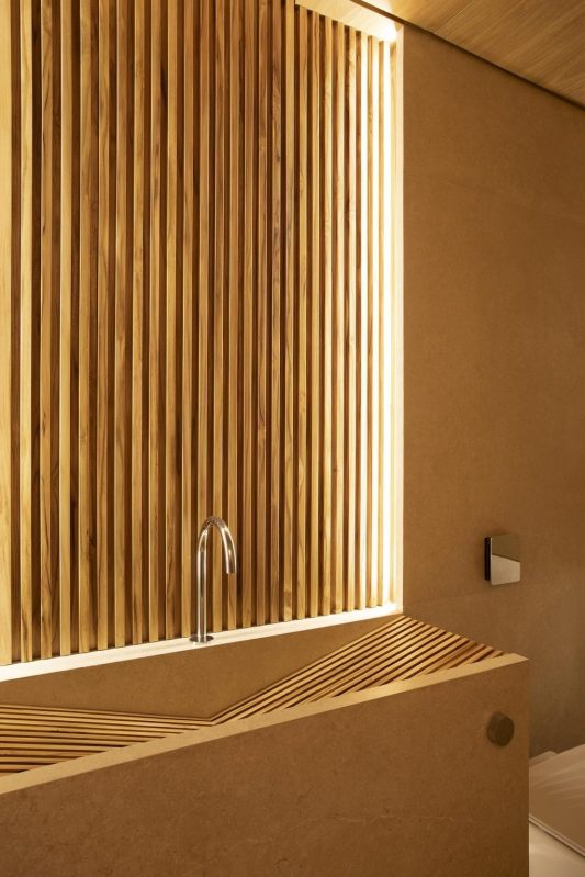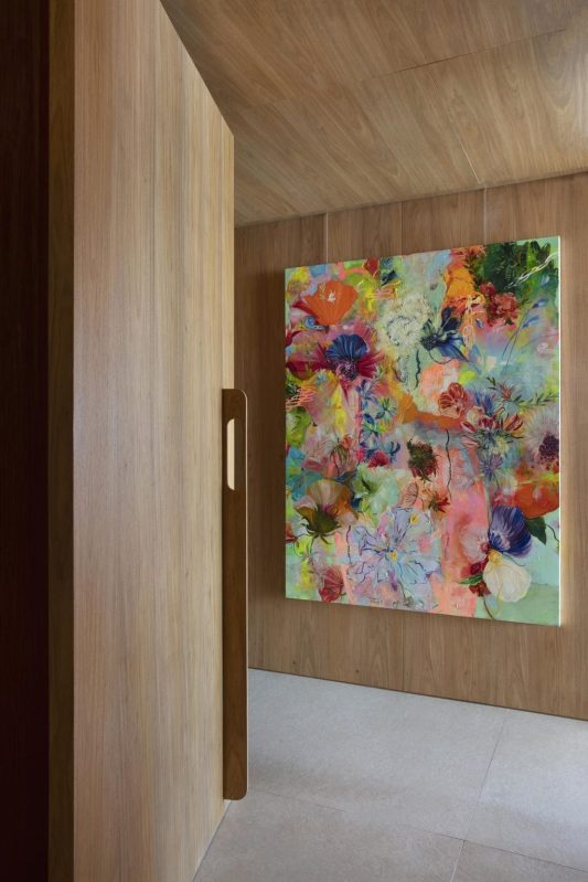 Les espaces de vie se déploient avec une élégance décontractée. Un fauteuil Sergio Rodrigues Mole, des œuvres de Raul Mourão et un coin télévision chaleureux, orné d’une texture artistique appliquée à la main par Brigida de Murtas, contribuent à une atmosphère riche et vivante.