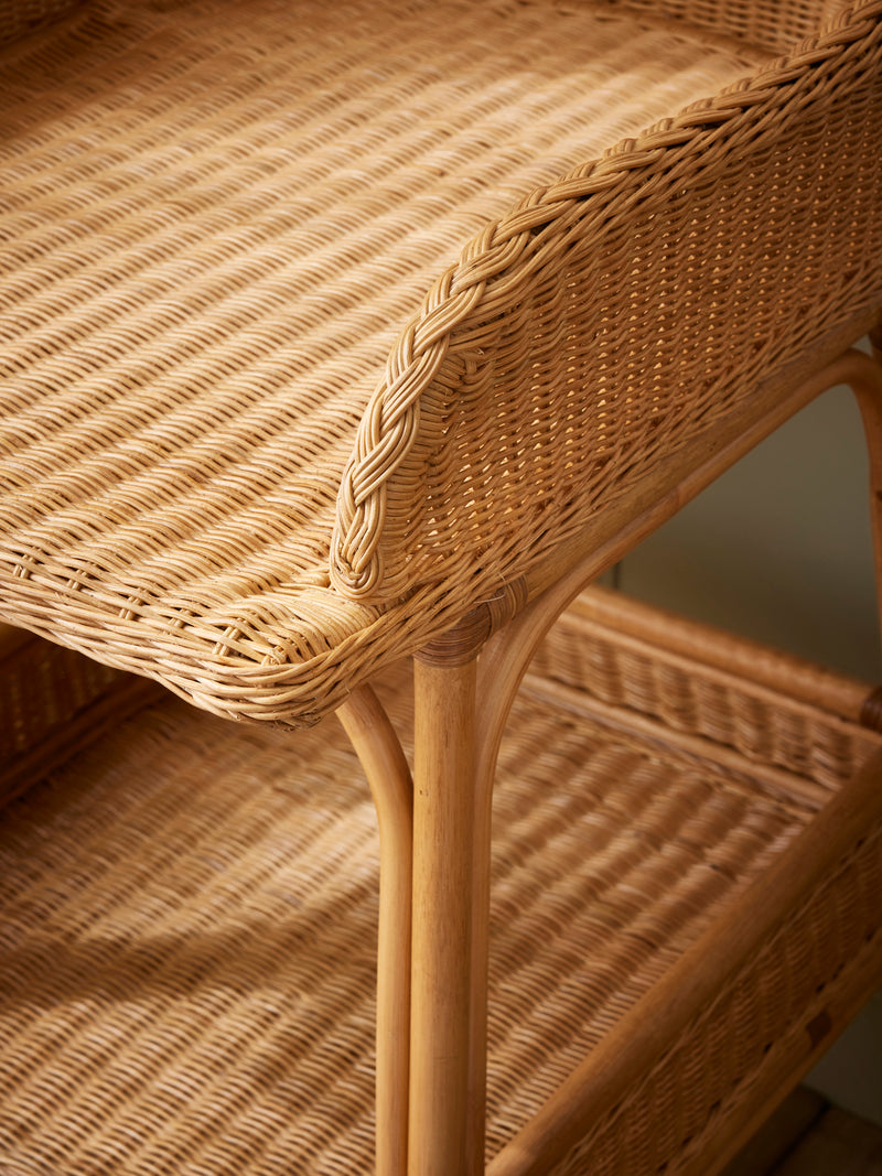 Plongeon dans les années 60/70 avec cette table à langer poétique et naturelle imaginée par les designers Cyrillus et fabriquée de façon artisanale dans des ateliers traditionnels en Indonésie. Table à langer en rotin tressé main couleur miel teinté contrasté de liens coloris caramel. Son design élégant et intemporel lui offre une personnalité empreinte de nostalgie et de délicatesse.