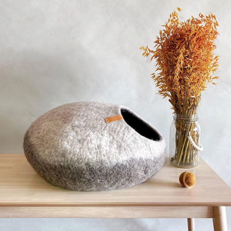 En adoptant la maison chat Gupha, votre félin dispose d’une zone de repos pleine de douceur. Cette grotte pour chat est réalisée avec soin à partir de feutre de laine 100% naturel, un matériau préféré de nos félins. Son design ovale procure un sentiment de sécurité, tandis que sa matière crée une sensation cocooning. Avec une forme facilement adaptable, elle peut être aplatie et utilisée comme un lit, en plus de sa fonction grotte. Fait à la main individuellement, chaque modèle est unique : de légères variations de taille peuvent se produire.
