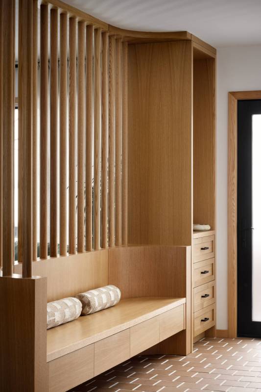 L’entrée donne le ton à toute la maison : calme, pratique et accueillante. Un banc intégré à lattes de bois verticales adoucit la forme carrée du plan d’origine, offrant à la fois une assise et une séparation subtile avec la pièce à vivre principale. Associé à un parquet chaleureux et à un carrelage, ce design confère à l’espace une luminosité, une harmonie et une organisation optimales, idéales pour une famille active et active.