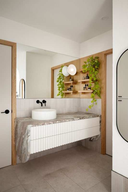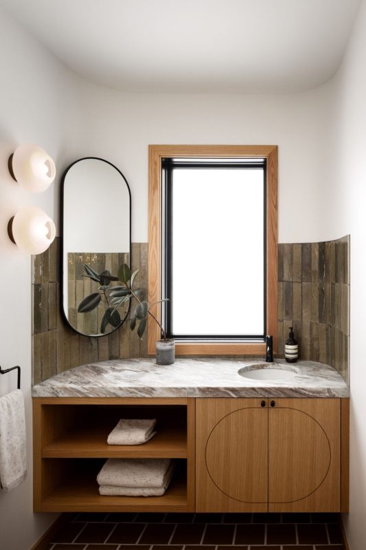Petite mais percutante, la salle de bains illustre parfaitement la philosophie « courbes et fantaisie » de la maison. Au lieu de se heurter à une fenêtre, l’équipe a relevé le défi en décalant le miroir de la coiffeuse, créant ainsi un équilibre asymétrique et zen. Un rappel qu’un bon design n’est pas toujours synonyme de symétrie, mais d’harmonie.