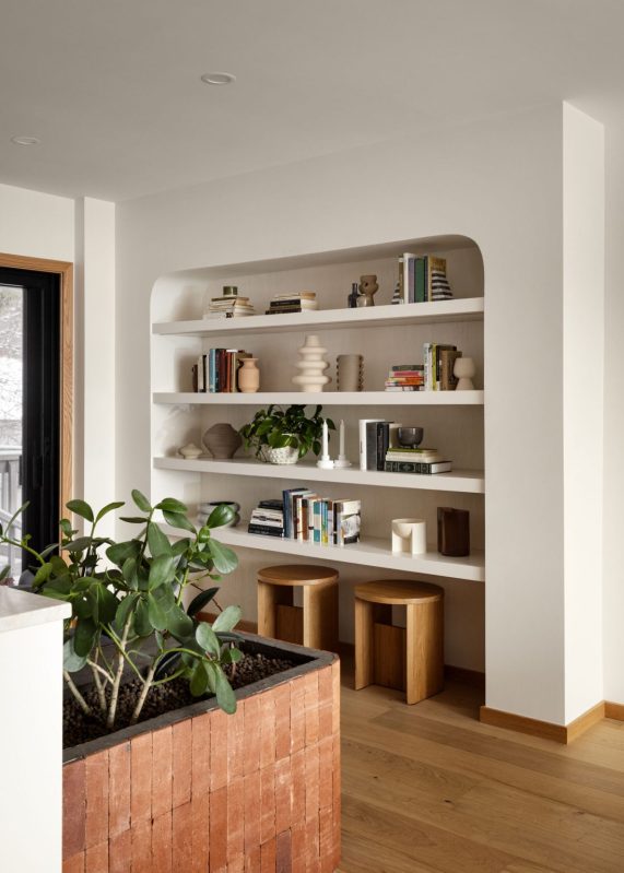 Niché dans une niche murale aux courbes douces, le coin lecture allie étagères sculpturales et fonctionnalité discrète. Des étagères intégrées accueillent un assortiment soigné de livres, de céramiques et de plantes, alliant praticité et esthétique de galerie. En dessous, deux tabourets en bois massif invitent à la flânerie, que ce soit pour feuilleter un livre ou prendre un café. La forme arquée adoucit la pièce, tandis que le style soigné crée un espace décontracté et convivial, un petit coin conçu pour ralentir le rythme.