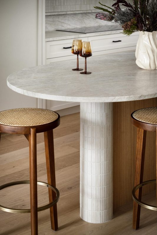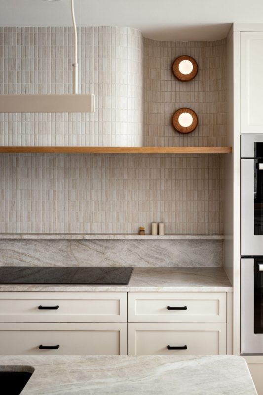 Le salon est agrémenté d’une cheminée aux carreaux fins de style Kit Kat, apportant texture et mouvement subtil à l’espace. Les lignes verticales du carrelage font écho aux formes courbes de la maison, créant un point focal à la fois moderne et accueillant. Loin de dominer la pièce, la cheminée l’ancre discrètement, chaleureuse, sculpturale et raffinée.