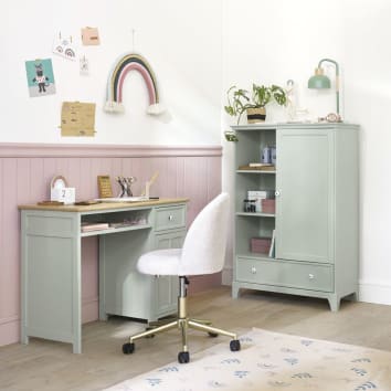 Chaleureux et tendance avec son plateau en bois, le bureau 1 porte et 1 tiroir vert ANTWERP s’accordera parfaitement à tous les meubles de la chambre de votre chouchou. Compact et rangeant, ce bureau pourra accueillir toutes les affaires de votre enfant pour ses moments studieux et créatifs. Avec ses jolies moulures et ses poignées de portes délicates, il a vraiment tout pour plaire !