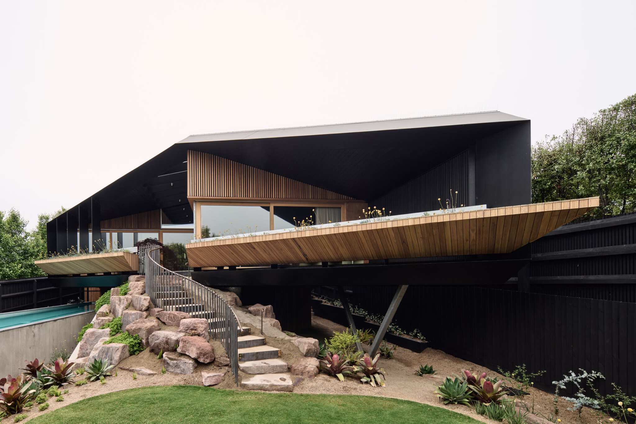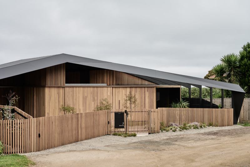 La façade de la maison, à la fois audacieuse et naturelle, allie une géométrie nette à des matériaux chaleureux et tactiles. L’extérieur est habillé d’un bardage à clin Blackbutt, lui conférant une sensation douce et organique qui s’harmonise parfaitement avec les angles prononcés du design. La toiture foncée en Trimdeck Colorbond crée un contraste saisissant et encadre la structure de lignes épurées qui attirent le regard.
