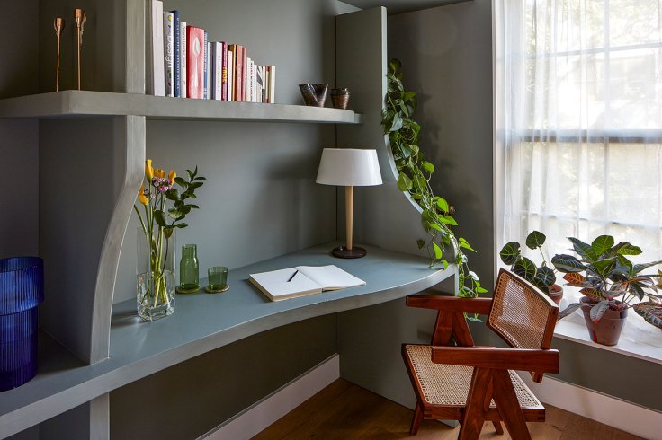 L’un des éléments les plus audacieux de l’espace de vie principal, surtout dans la salle à manger, est cette étagère sculpturale de 4,5 mètres de haut, avec ses ondulations vertes qui explosent sur le mur. Sa silhouette fluide, comme un ruban en mouvement, est façonnée à partir de couches de bois CNC fraîchement travaillées et judicieusement superposées, tandis que sa teinte verte se marie à la perfection avec les suspensions du client. À la fois esthétique et pratique, cette étagère ne se contente pas d’être un simple meuble : elle se transforme en buffet flamboyant, mettant en lumière le talent indéniable de Batliboi pour métamorphoser des solutions fonctionnelles en véritables œuvres d’art.