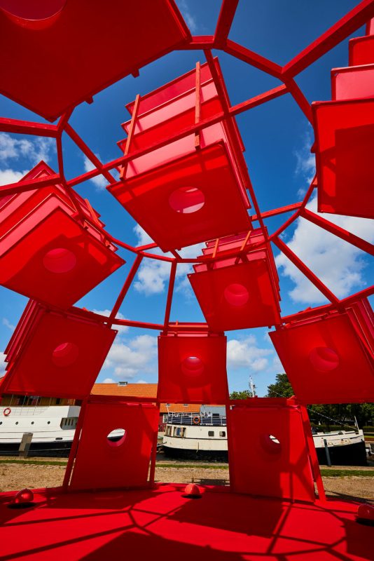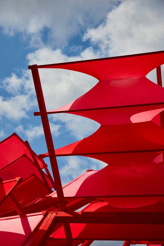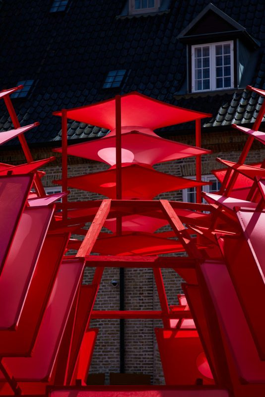 de Verner Panton (1971) , dont la silhouette emblématique et la distribution lumineuse exceptionnelle en font un modèle intemporel. Des écrans de tissu sont suspendus dans une explosion éternelle, un rouge vif décorant l’ensemble de la structure, à l’image de l’énergie de la forme. L’accès à la pièce se fait par le centre, formant une cavité intérieure, au cœur du cyclone.