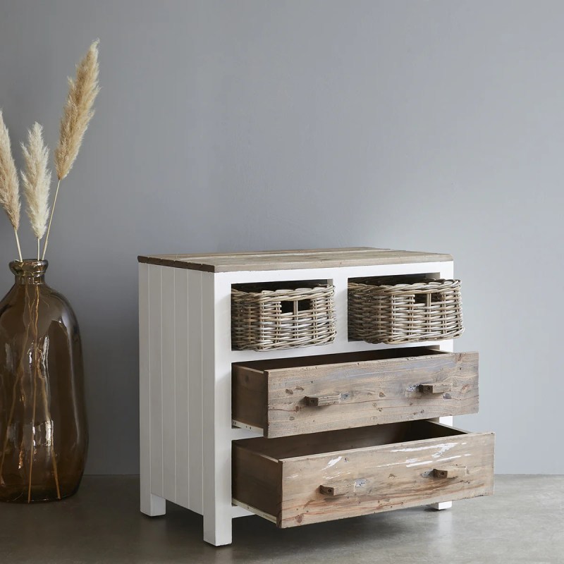 Ce petit meuble de rangement est parfait pour ranger vos vêtements dans votre chambre. Cette commode en bois de pin recyclé mixte dispose de 2 grands tiroirs et 2 niches avec des paniers en osier intégrés, elle vous garantit durabilité et robustesse. Grâce à son concept moderne, elle peut être utilisée presque partout : elle se combine avec d’autres meubles et s’adapte à toutes les pièces.