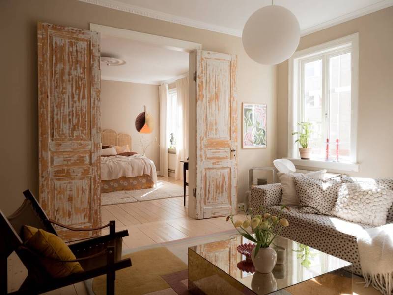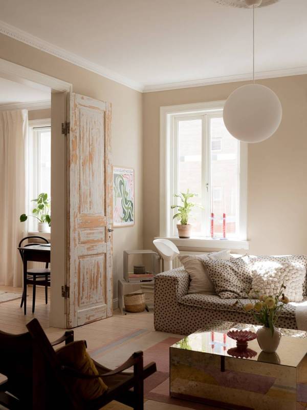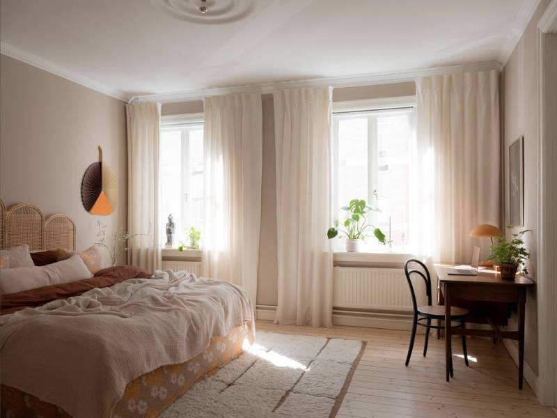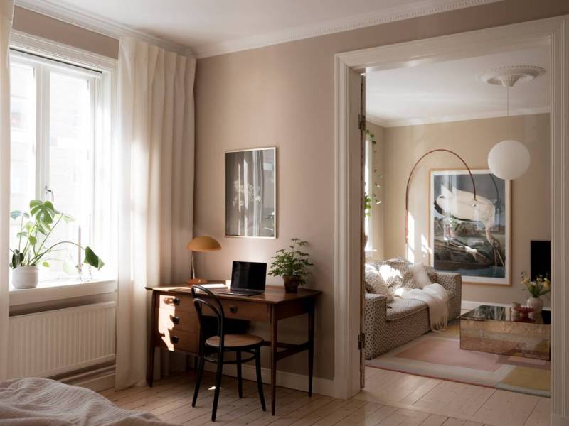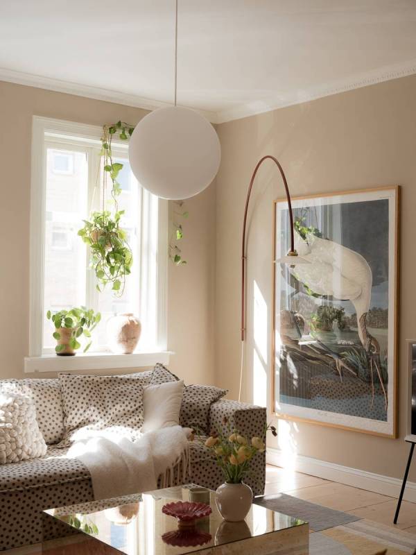 Le salon se distingue par ses hauts plafonds majestueux, ornés de stucs délicats et d’une rosace centrale éblouissante. Deux larges fenêtres inondent la pièce d’une lumière dorée, créant une atmosphère accueillante et chaleureuse. Les portes doubles patinées, véritables œuvres d’art, relient harmonieusement le salon à la chambre principale. La décoration, dans des tons de beige apaisants, est rehaussée par des éléments enchanteurs tels que le canapé à pois espiègle et la grande affiche d’Audubon qui captive le regard. La spacieuse chambre aux murs taupe, qui lui donne une empreinte douce et chaleureuse, accueille un lit somptueux avec un coin bureau inspirant et de nombreux rangements astucieux. La chambre, un cocon douillet, est destinée a rêves enchantés. Cet appartement sublime, qui conjugue élégance historique, luminosité éclatante et fonctionnalité