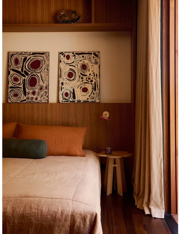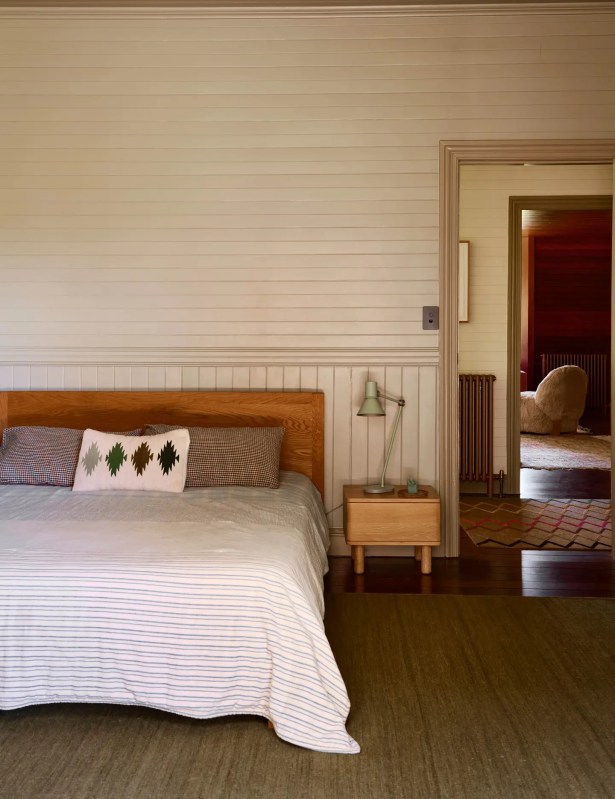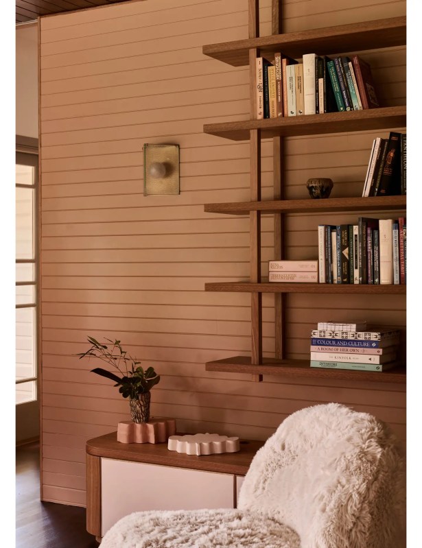 Les planchers en bois foncé et les murs blancs sont entrecoupés de placages en bois de gommier tacheté chaud, de panneaux peints en rose doux et de tapis à motifs.