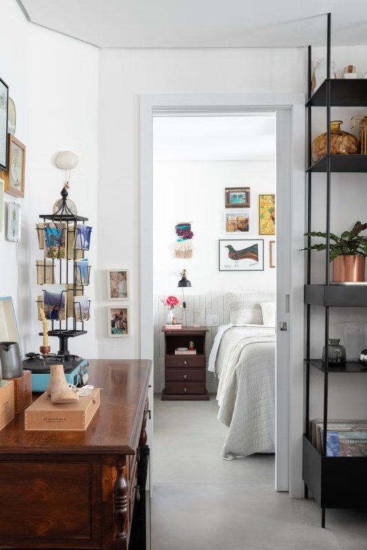 Le mobilier et les objets de décoration sont un catalogue de souvenirs de famille et de trouvailles personnelles. Dans la cuisine, un meuble laqué bleu trône : il appartenait à sa mère, et la teinte choisie rappelle celle de sa grand-mère . Dans le salon, un buffet, autrefois bureau familial, abrite aujourd’hui un tourne-disque et dissimule une petite cave à vin.