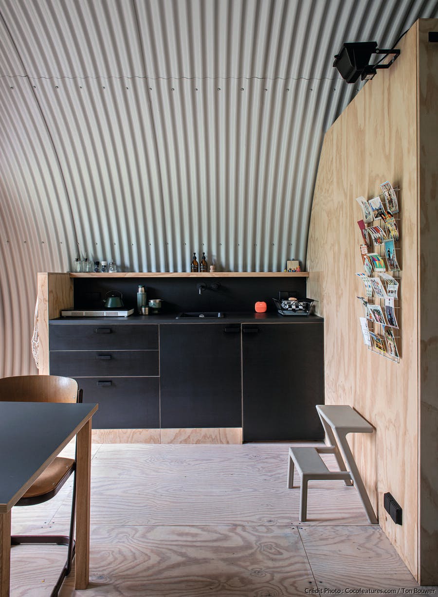Composée en majeure partie de bois de bouleau à croissance rapide, chaque morceau de la structure et de la composition de cette tiny house a été pensé dans une logique durable et écoresponsable. Sur le mur en contreplaqué qui sépare la cuisine et la salle de bains, une étagère à carte postales apporte couleur et côté arty