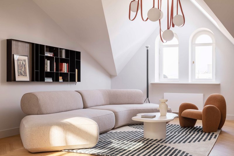 appartement FOKSAL, conçu par indoor , un studio de design d’intérieur polonais, transforme les singularités architecturales en espaces de vie captivants. Nichée dans les combles d’un immeuble du XIXe siècle de la rue Foksal, la résidence défie les attentes du dernier étage d’un immeuble historique : troquant les pièces sombres et exiguës pour un havre de paix lumineux et contemporain.