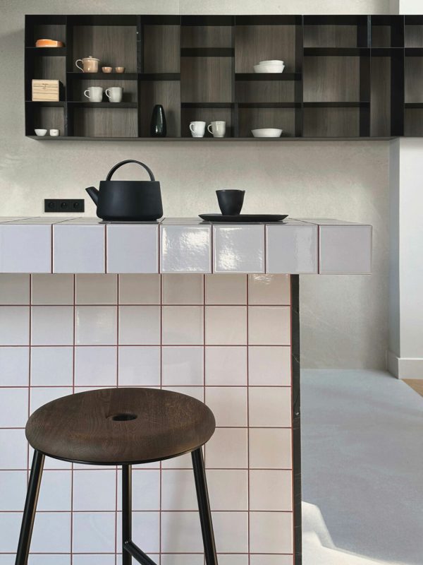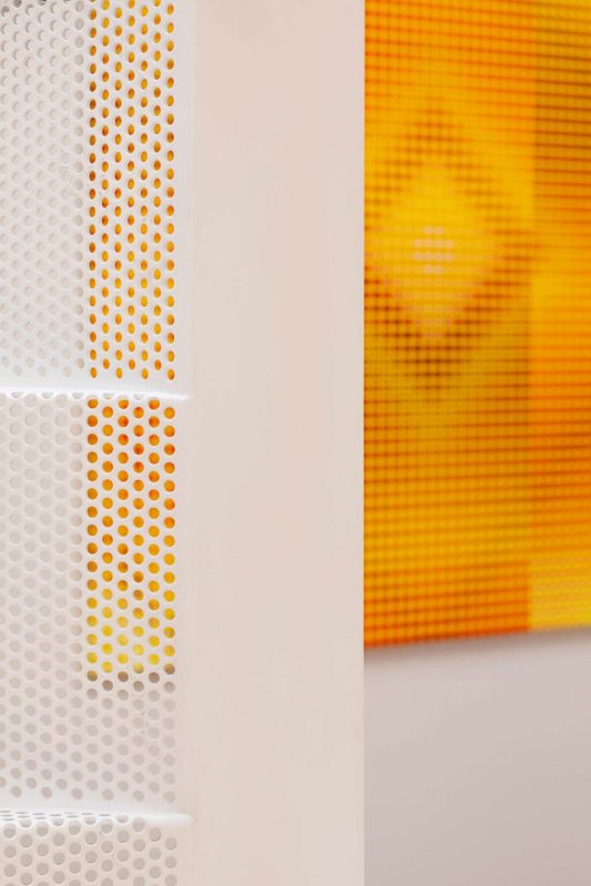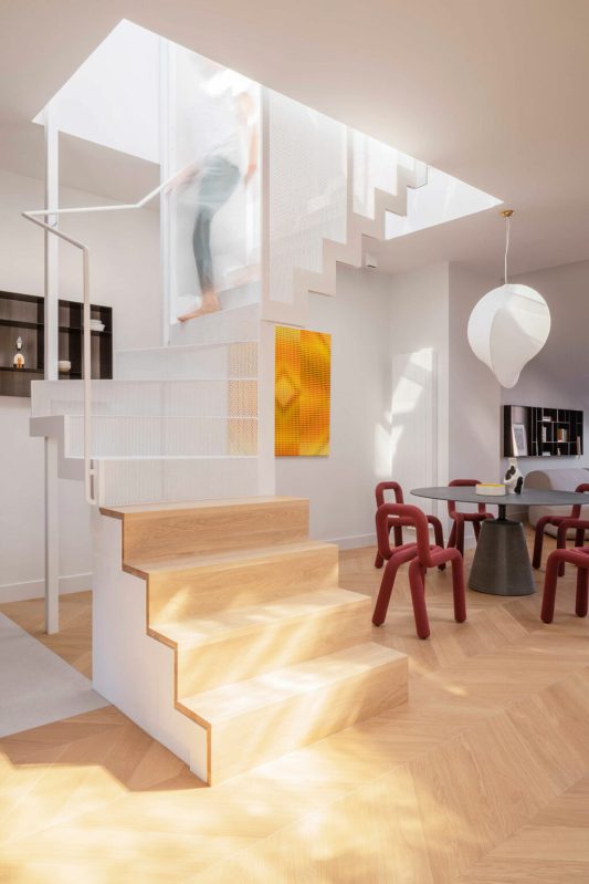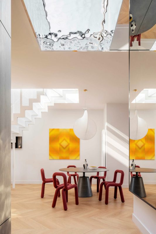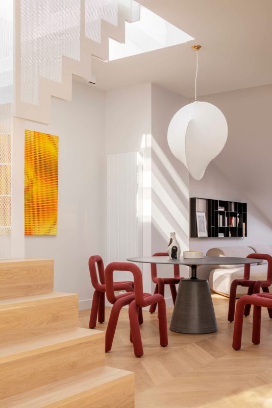La lumière est omniprésente dans la cage d’escalier, où des panneaux d’acier perforés filtrent la lumière du soleil en motifs complexes qui évoluent au fil de la journée. L’escalier mène à l’un des points forts de l’appartement : une table à manger ronde de MDF Italia, entourée de chaises sculpturales Bold Chairs de Moustache, sur fond d’un tableau éclatant et coloré de Pawel Wasowski.