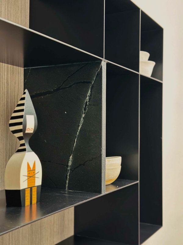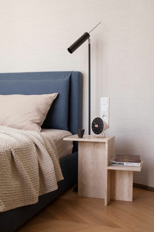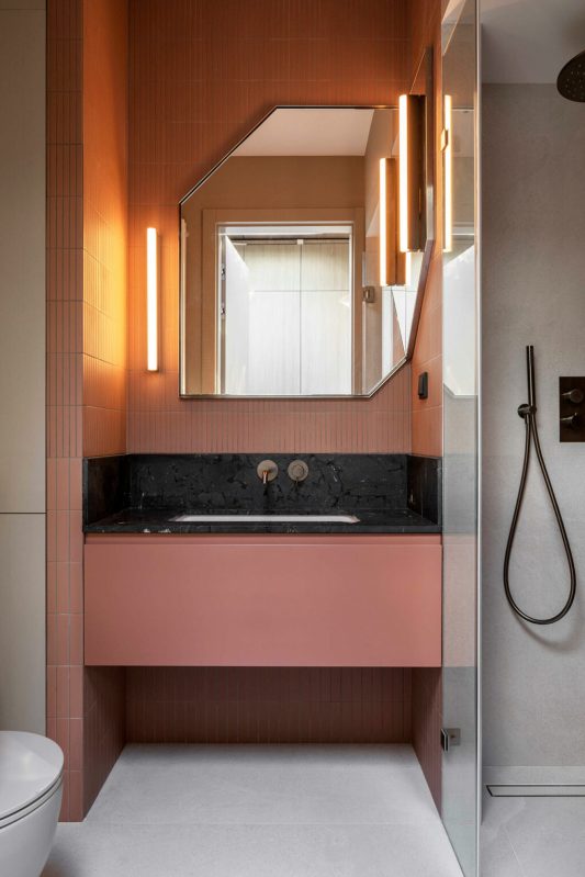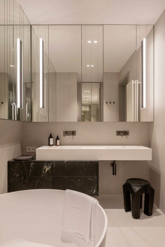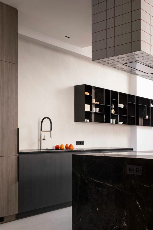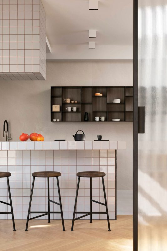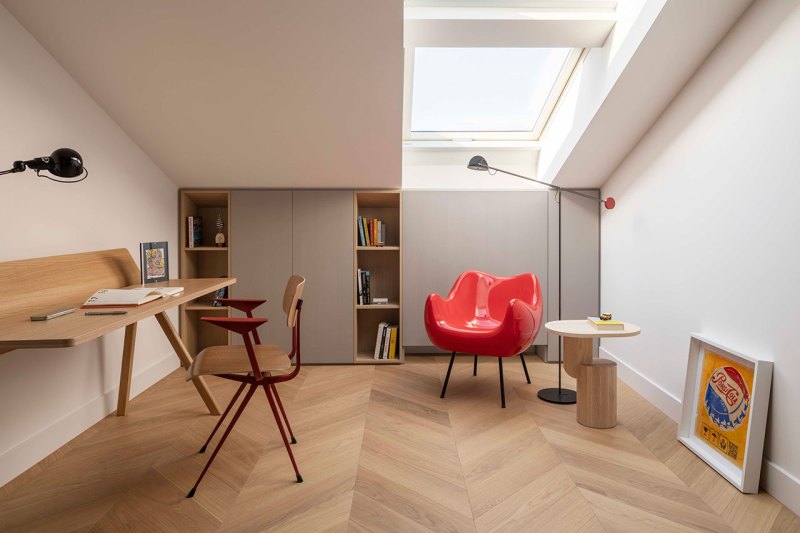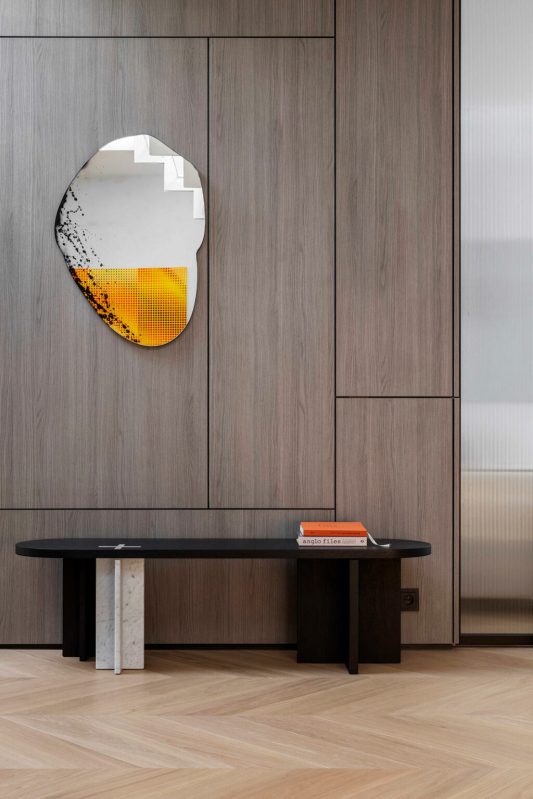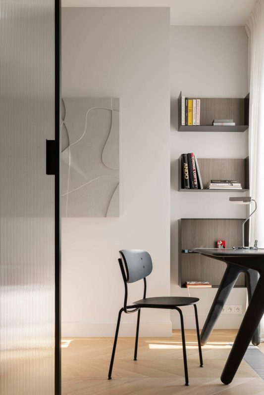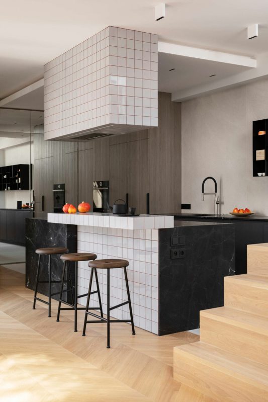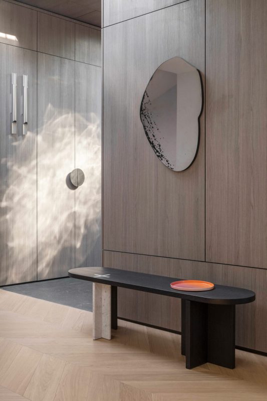 L’empreinte inhabituelle de l’appartement a constitué le premier obstacle. Les plafonds mansardés, les multiples fenêtres aux formes variées et l’agencement labyrinthique auraient pu paraître contraignants. Au lieu de lutter contre ces éléments, les designers les ont adoptés, traitant chaque irrégularité comme une opportunité de créativité. La transformation a commencé par une attention particulière portée à la lumière naturelle. Des puits de lumière ont été installés stratégiquement dans le couloir, leurs cadres en miroir et leurs panneaux d’acier ondulés amplifiant la sensation d’ouverture verticale. Dès l’entrée, on a l’impression d’entrer dans un espace où l’architecture fusionne avec le ciel.