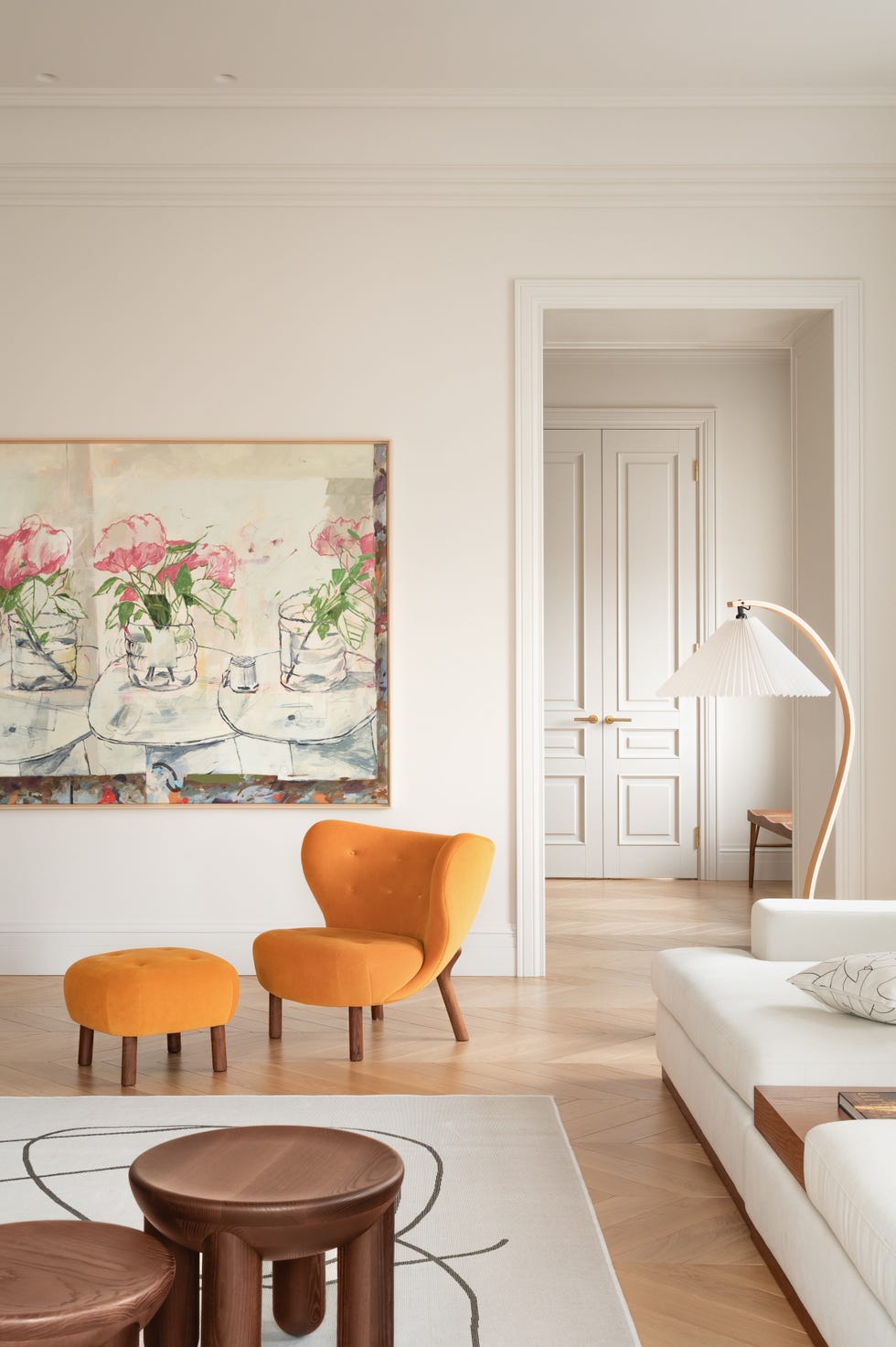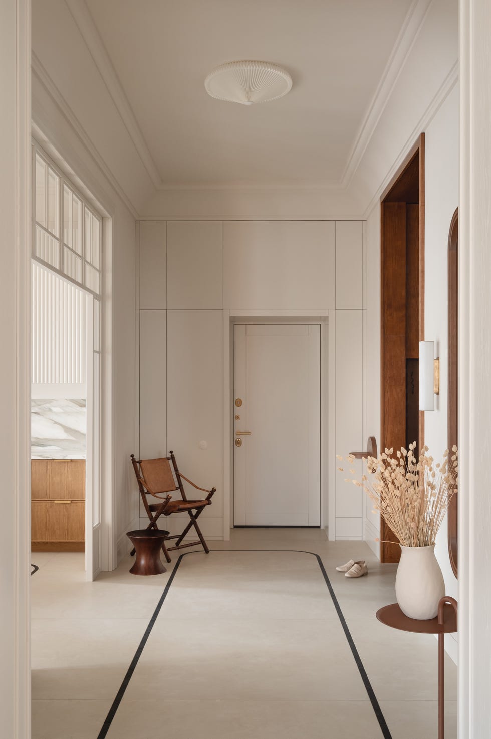 Les moulures décoratives des plafonds rappellent l’essence du début du XXe siècle , tandis que les arches et les portes en bois créent un rythme élégant qui relie le passé et le présent.