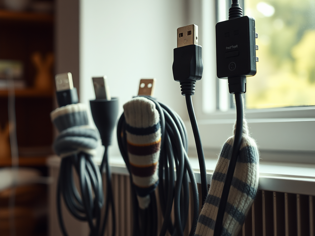 Au lieu d’exposer les cordons électriques des appareils et les multiprises partout dans la maison, une option consiste à les décorer de manière simple et pratique : recouvrez-les de chaussettes inutilisées. Pour ce faire, insérez le cordon dans la chaussette jusqu’à la prise, le dissimulant ainsi pratiquement. N’oubliez pas que nous introduisons une idée bien plus originale dans votre intérieur.