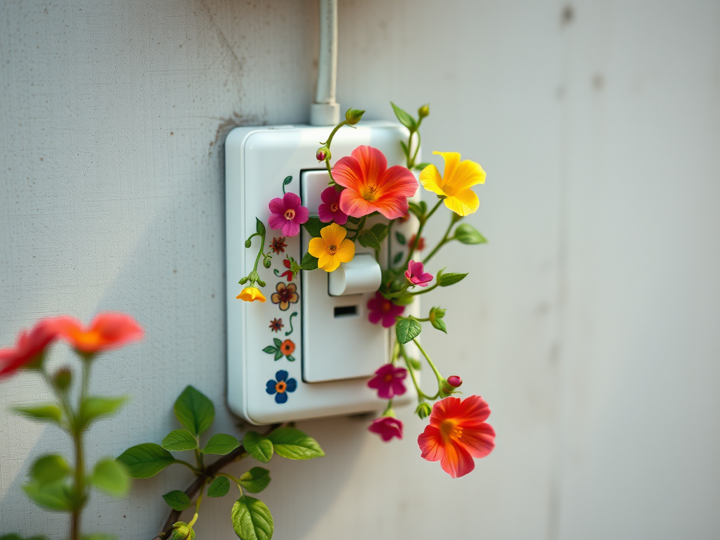 Les interrupteurs de la maison peuvent aussi être décorés de dessins.On vous en présente un exemple à la fois beau et dynamique : des plantes fleuries poussent directement sur le boîtier électrique, « leur donnant de la personnalité et une nouvelle vie »