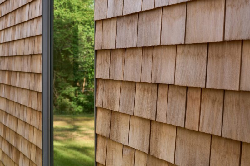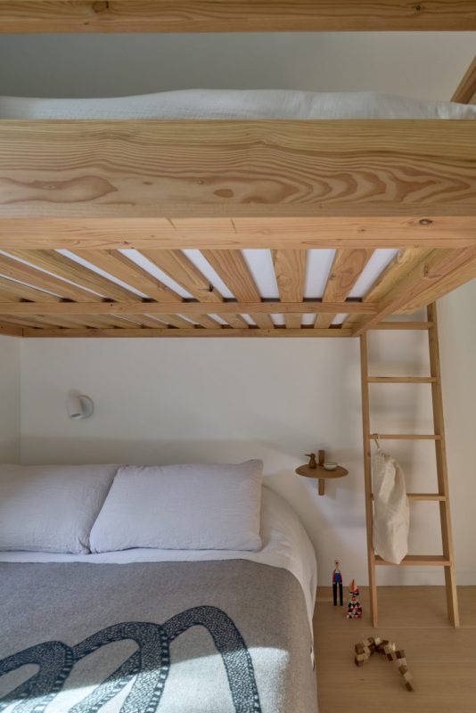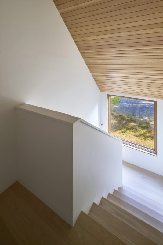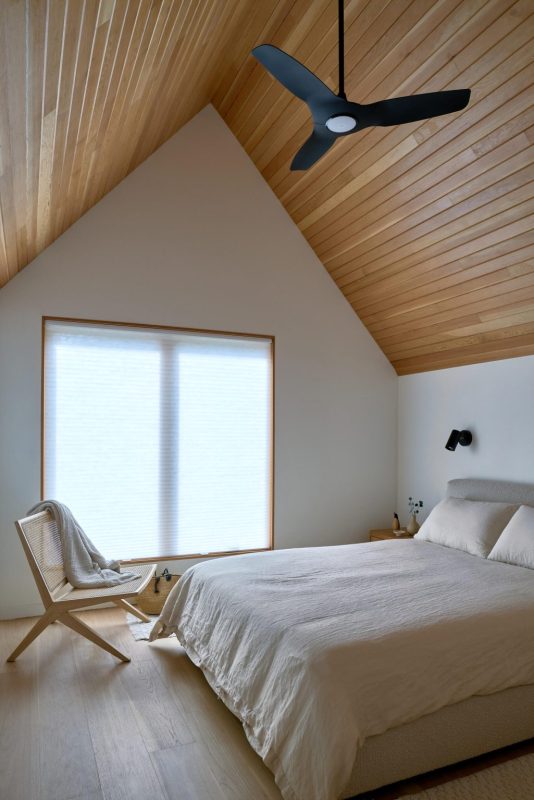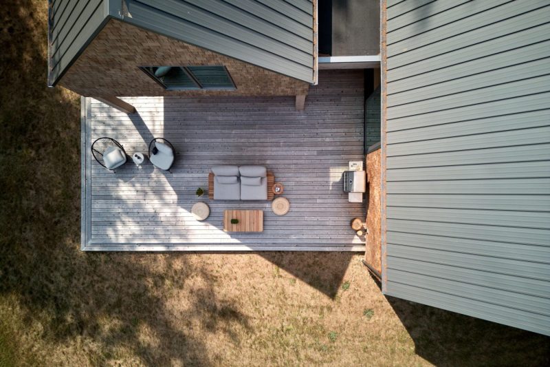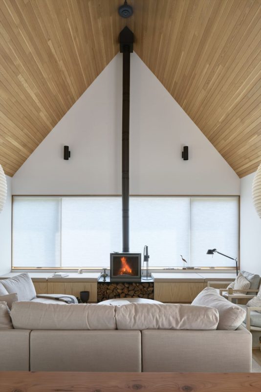 La maison est composée de deux bâtiments distincts reliés par une entrée formelle commune, établissant un sentiment de connexion tout en préservant l’intimité. Sa forme simple et linéaire et sa palette de matériaux sobre mettent en valeur des lignes modernes et épurées, permettant à la forêt environnante de rester la pièce maîtresse visuelle. De vastes fenêtres encadrent des vues filtrées sur les arbres et le ciel, attirant la lumière du jour au plus profond de l’intérieur.