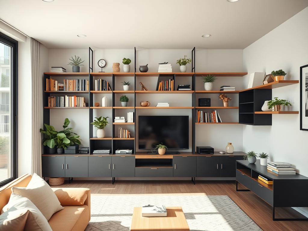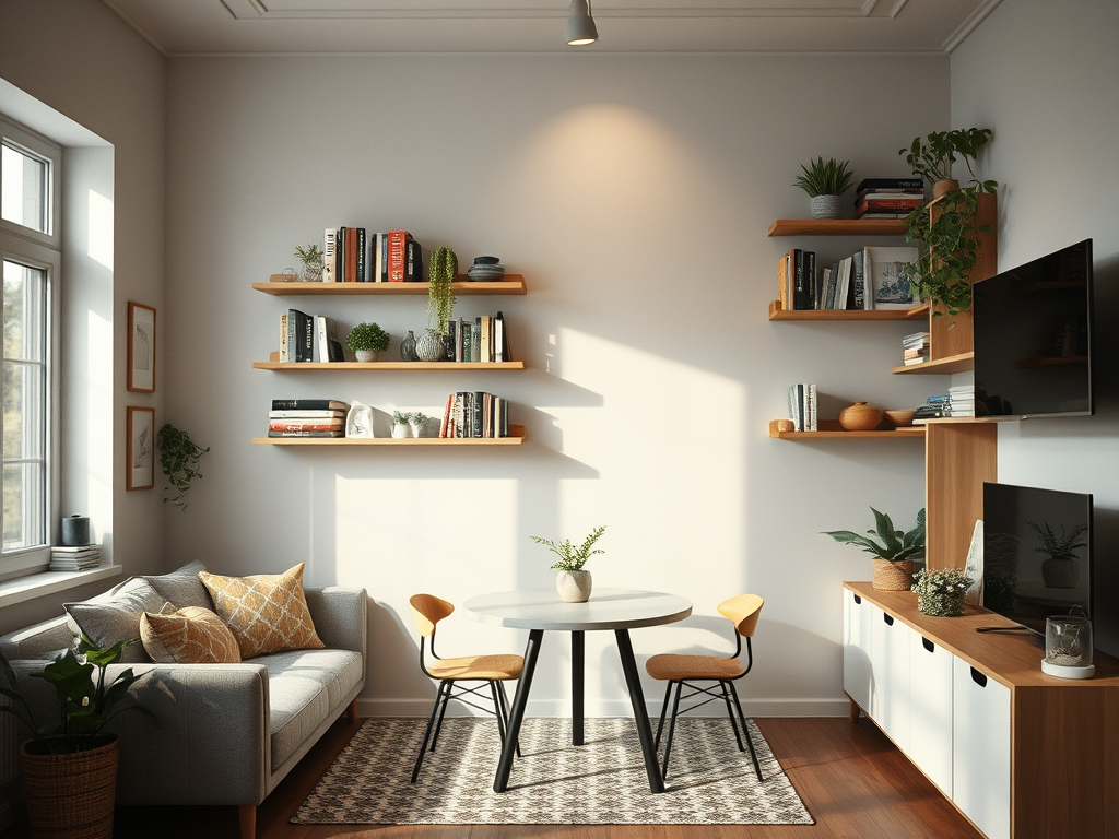 2- Exploiter les murs – Saviez-vous que les murs de votre petit salon-salle à manger peuvent être de véritables alliés pour optimiser l’espace ? En effet, les murs ne servent pas uniquement à suspendre des tableaux et des miroirs, ils peuvent également être utilisés comme rangement. Pourquoi ne pas installer des étagères murales modulables pour y poser vos livres, vos plantes ou encore vos bibelots préférés ? Vous pouvez aussi utiliser des boîtes de rangement esthétiques pour ranger vos affaires et les empiler sur les étagères.