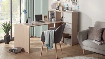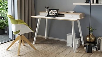 Le style, d’inspiration scandinave, caractérisé par un design minimaliste des pieds et par l’association du chêne naturel et du blanc permet d’intégrer aisément le bureau Elizey au sein de l’habitat. La partie sur-élevée du plan de travail intègre un espace de rangement astucieux composé de deux tiroirs et d’une niche ouverte : cette rehausse fonctionnelle permet de positionner un ordinateur en hauteur et améliore ainsi très sensiblement l’ergonomie du poste de travail.
