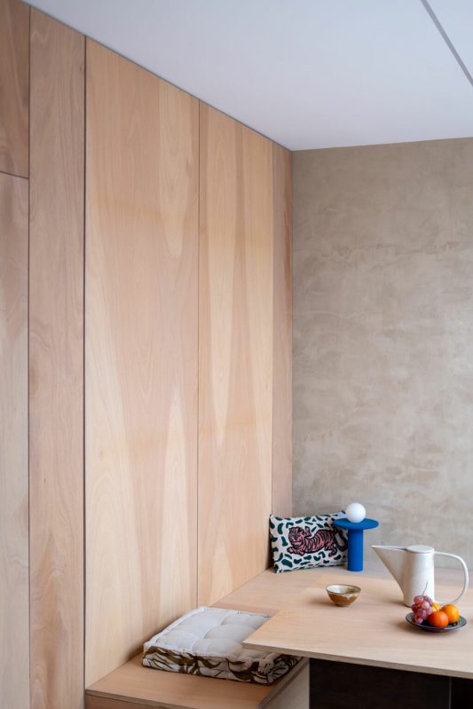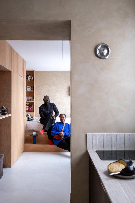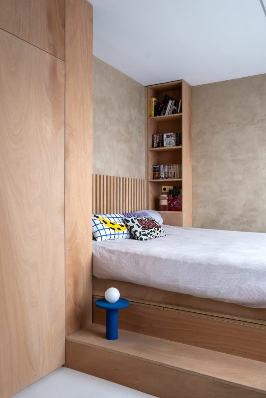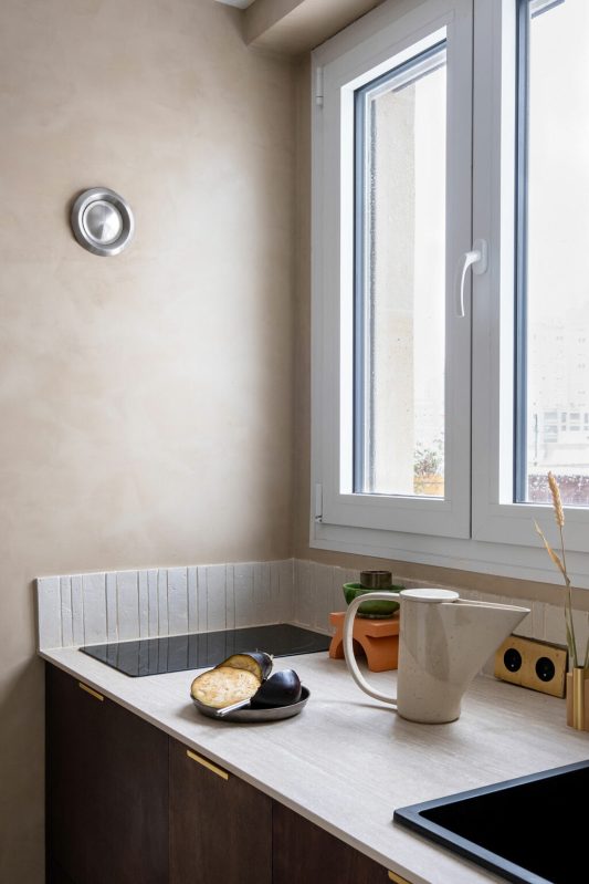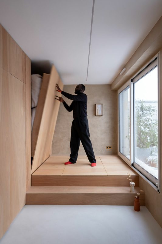 À Paris, où l’espace de vie est un luxe, BETH X EPISTĒMĒ STUDIO a transformé un micro- studio de 23 m² en un cocon raffiné au design minimaliste. Ce projet démontre comment un espace réduit peut allier fonctionnalité et esthétique sans compromis .La pièce maîtresse du studio est une plateforme surélevée sur mesure, réalisée en bois d’okoumé, qui constitue un noyau multifonctionnel où se déroule la vie quotidienne. La structure s’adapte parfaitement à différents besoins : elle devient un coin nuit, se transforme en table à manger ou en bureau, et dissimule de généreux rangements. En intégrant autant de fonctions dans un seul élément, les designers optimisent la flexibilité tout en conservant un espace ouvert et épuré.
