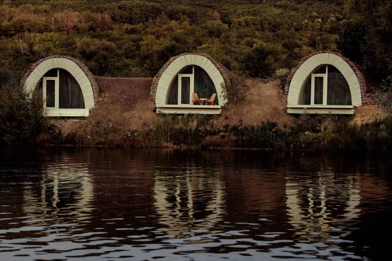 Osez remettre en question le conventionnel avec ces cabanes inspirées des mythiques habitations de hobbits, partiellement enfoncées dans le sol et coiffées d’un toit vert. Plutôt que de s’imposer comme de banals bâtiments, elles émergent comme des formes ondulantes qui osent réinventer le paysage. Les dômes audacieux insufflent une aura de protection, tandis que le vitrage panoramique fusionne audacieusement l’intérieur avec l’extérieur aquatique.