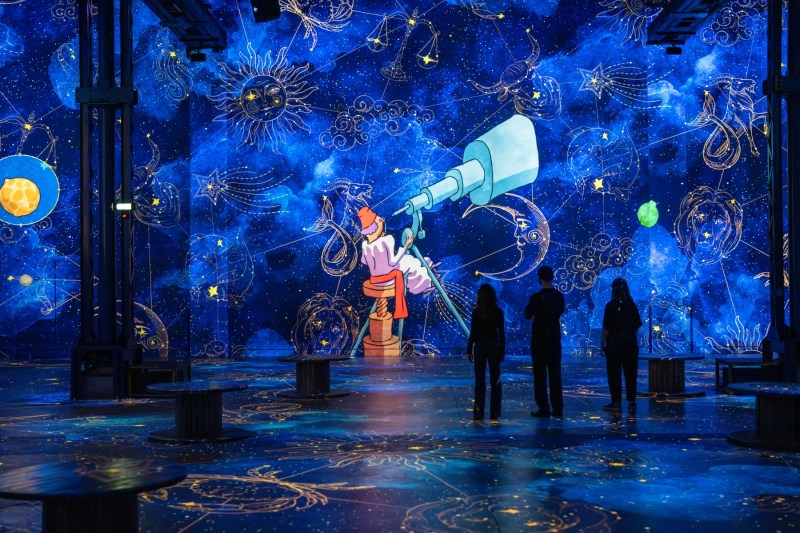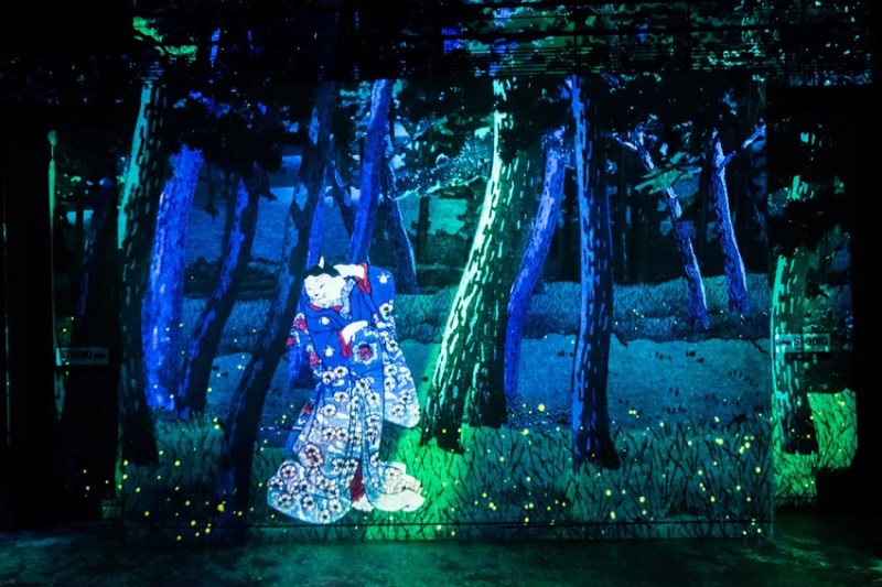 La beauté éphémère des cerisiers en fleurs laisse la place à une forêt magique et mystérieuse habitée par les « yokai », les esprits du folklore japonais et puis la mer, l’iconique grande vague d’Hokusai submerge l’espace accompagnée par la musique de Claude Debussy.