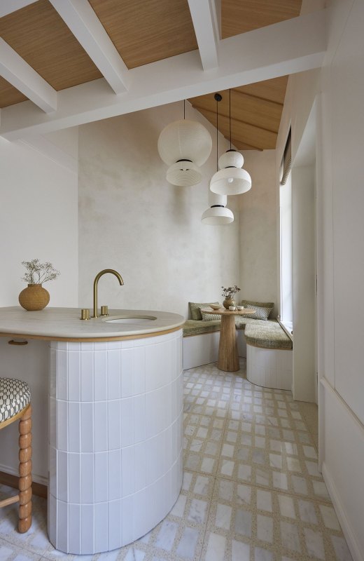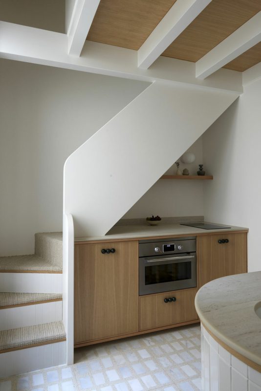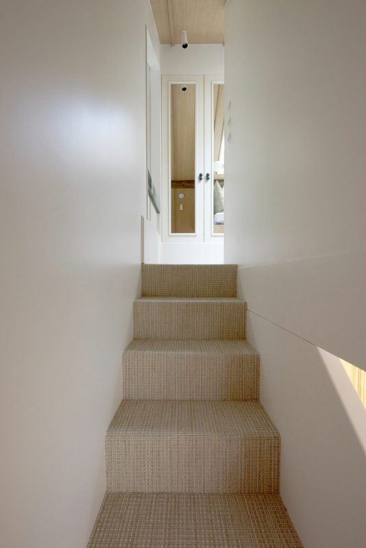 L’objectif principal de l’équipe de conception était de rendre l’espace fonctionnel et confortable pour un style de vie moderne, tout en préservant son charme d’origine. Le grenier, autrefois utilisé pour le stockage du foin, a été transformé en mezzanine, tirant pleinement parti des hauts plafonds atteignant près de 6 mètres à l’arrière de la structure. Cette utilisation astucieuse de l’espace offre un espace nuit dédié, donnant à cette maison compacte une impression d’espace bien plus grand qu’elle ne l’est en réalité.