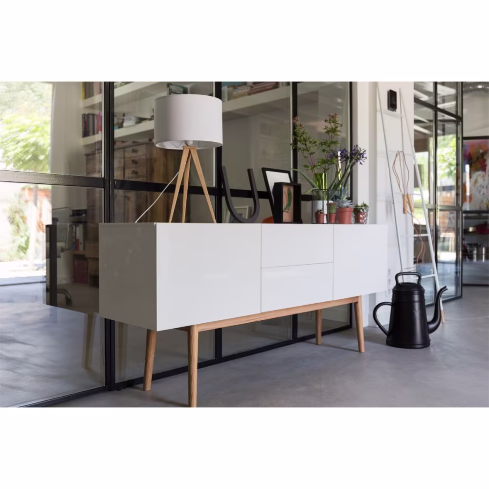 HIGH WOOD – Buffet design 2 portes 2 tiroirs scandinave blanc . Un meuble look scandinave design et bien pratique pour ranger vaisselle, verres, vases ou autres papiers, bref tout ce dont on a besoin à la maison mais qu’on ne veut pas montrer !