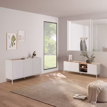 Artic – Buffet Scandinave blanc 299,00 € . ce buffet style scandinave vous offrira un beau volume de rangement. Le détail déco : les pieds légèrement évasés qui rappellent le design des années 50. Notre conseil : décorez le plateau avec les objets déco de votre choix.