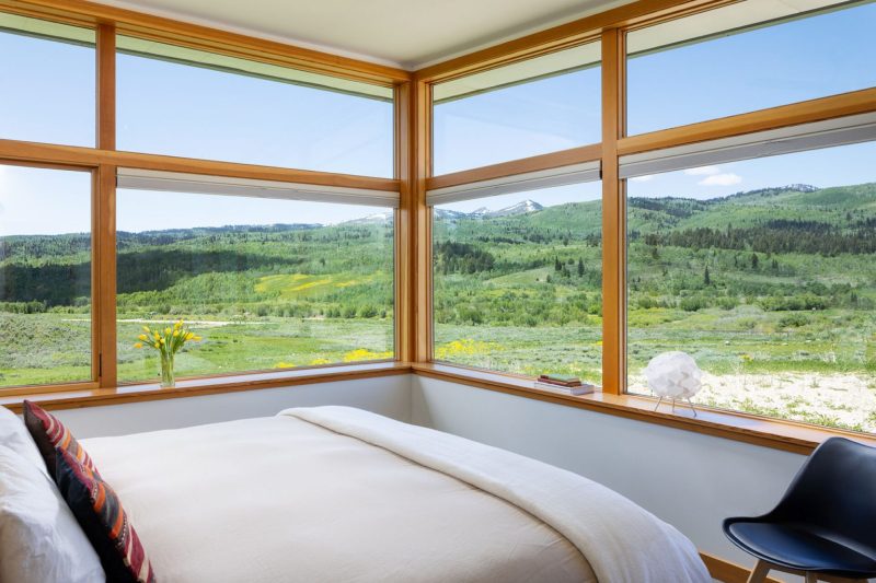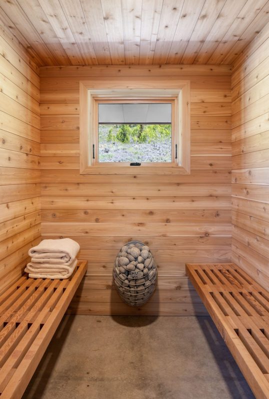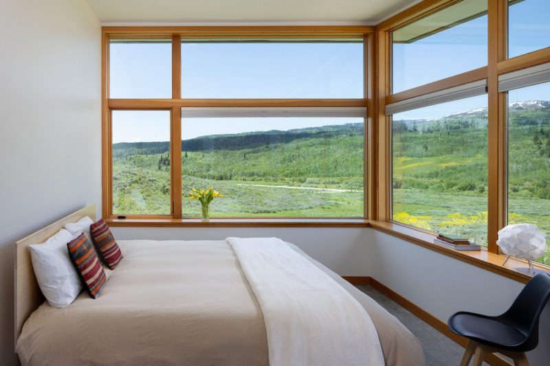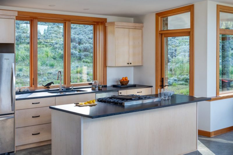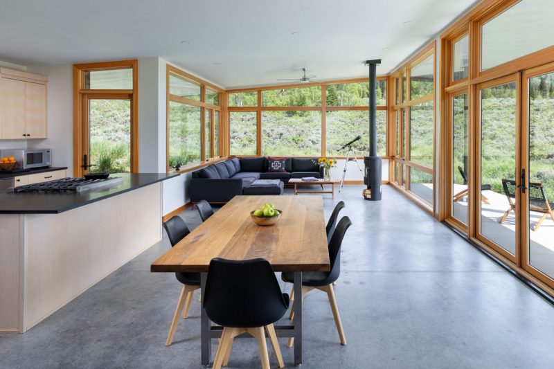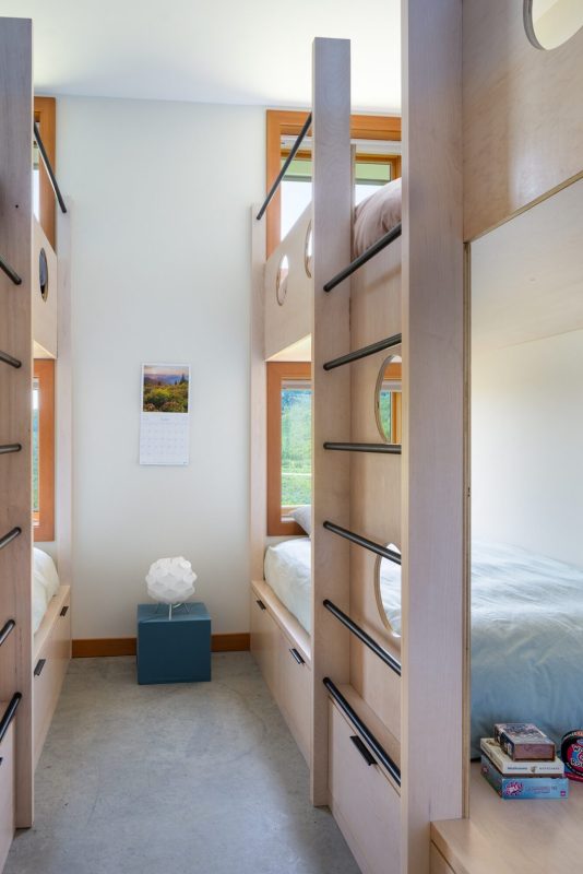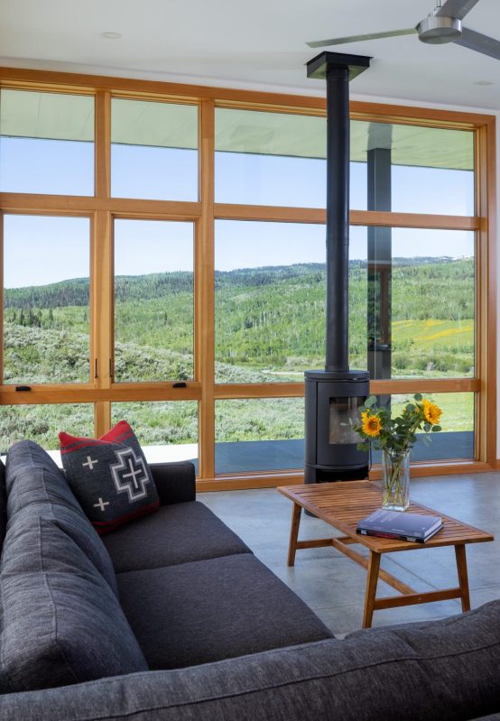 Une orientation réfléchie, un vitrage généreux et des surplombs de toit profonds optimisent le gain solaire en hiver tout en offrant de l’ombre en été, et un panneau solaire et un générateur de secours rendent la maison entièrement hors réseau.
