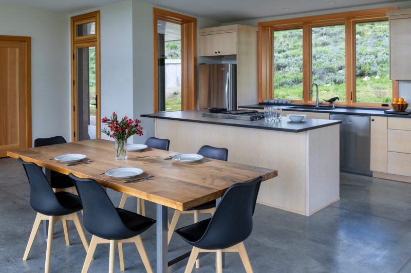À l’intérieur, la grande pièce constitue le point d’ancrage de la maison. Les fenêtres orientées sud-ouest encadrent les collines environnantes, inondant l’intérieur de lumière naturelle et offrant une vue imprenable sur le paysage désertique. Les sols en béton créent une masse thermique, garantissant un confort optimal toute l’année.