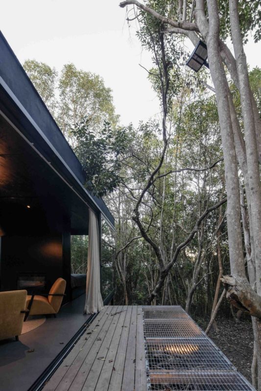 Un pont métallique discret s’étend de l’entrée, mettant l’accent sur l’idée d’une structure qui flotte sur le terrain plutôt que de l’imposer. Ce geste renforce l’équilibre entre l’architecture et le paysage.
