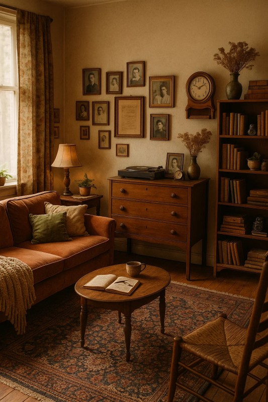 • Couleurs et textures évocatrices : palettes douces, patines, matières naturelles, textiles qui rappellent la maison d’enfance (dentelle, velours, bois massif, tapis épais).