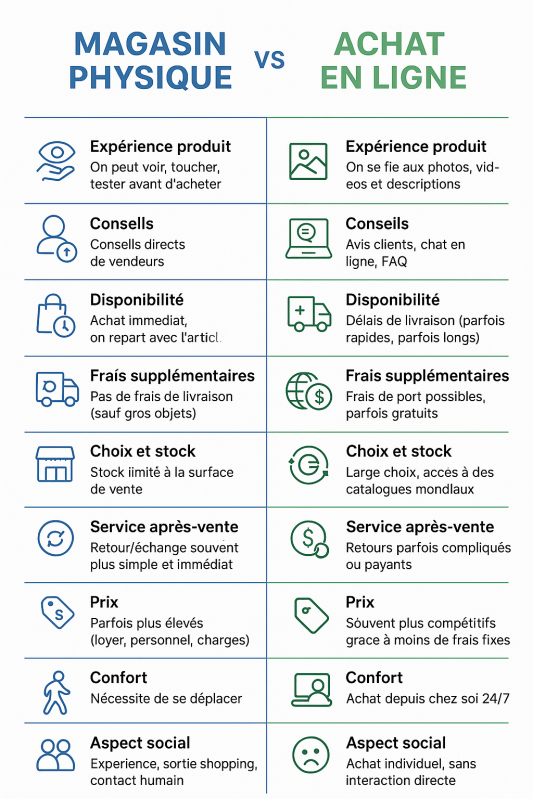 Voici un tableau comparatif clair entre magasin physique et achat en ligne :