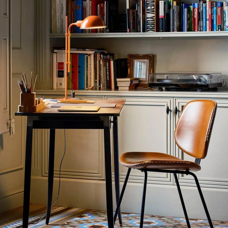Avec sa couleur orangée et son allure rétro, cette lampe devient immédiatement le point fort du bureau. Elle diffuse une lumière chaude qui crée une atmosphère cosy, idéale pour écrire ou travailler tard le soir. Placée devant une bibliothèque, elle accentue le charme classique de la pièce.