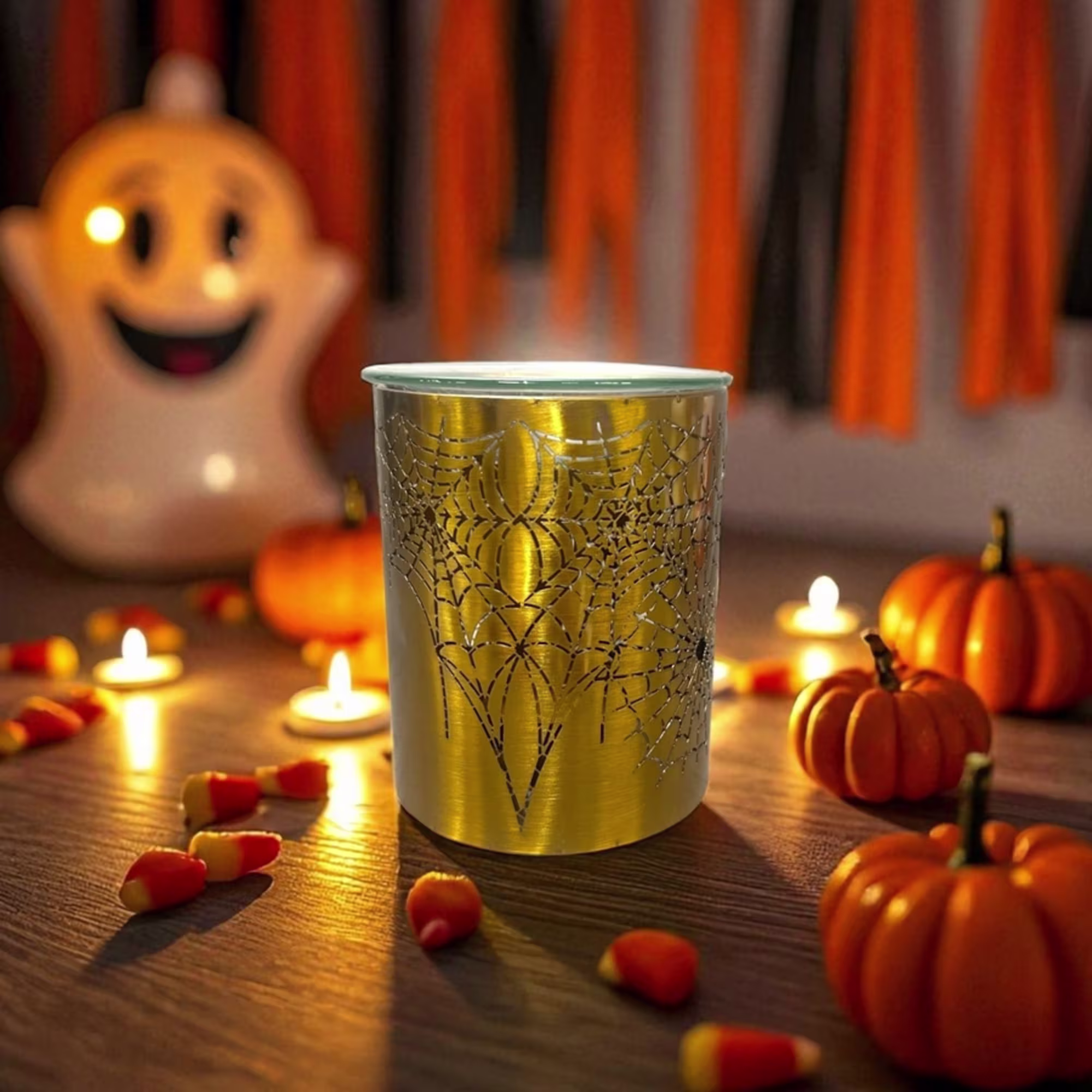 Brûle-parfum Halloween métal doré – Motif toile d’araignée