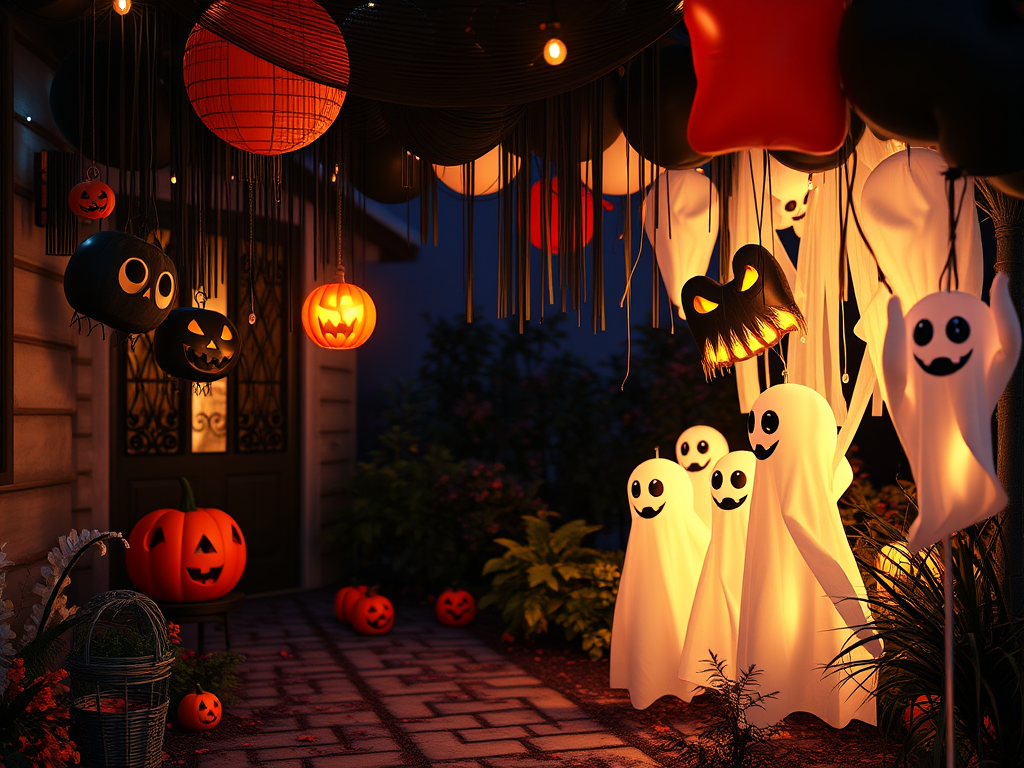Laisser de côté son extérieur au moment de cette fête folklorique serait dommage. L’ambiance d’ Halloween commence dès le jardin ou votre allée ! Là aussi, faites appel à une multitude d’astuces facile à faire soi-même pour réaliser une décoration terrifiante. Accrocher des ballons emballés dans du tulle noir sur le portail, des guirlandes de fantômes crée à l’aide de sucette et de tissu blanc, un ballon devenu un œil… Les idées ne manquent pas pour créer l’atmosphère effrayante digne d’un Halloween.