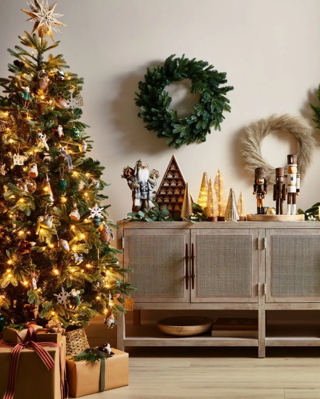 - Décorations : tons naturels (bois, paille, rouge, blanc), chandeliers à bougies, étoiles lumineuses aux fenêtres.